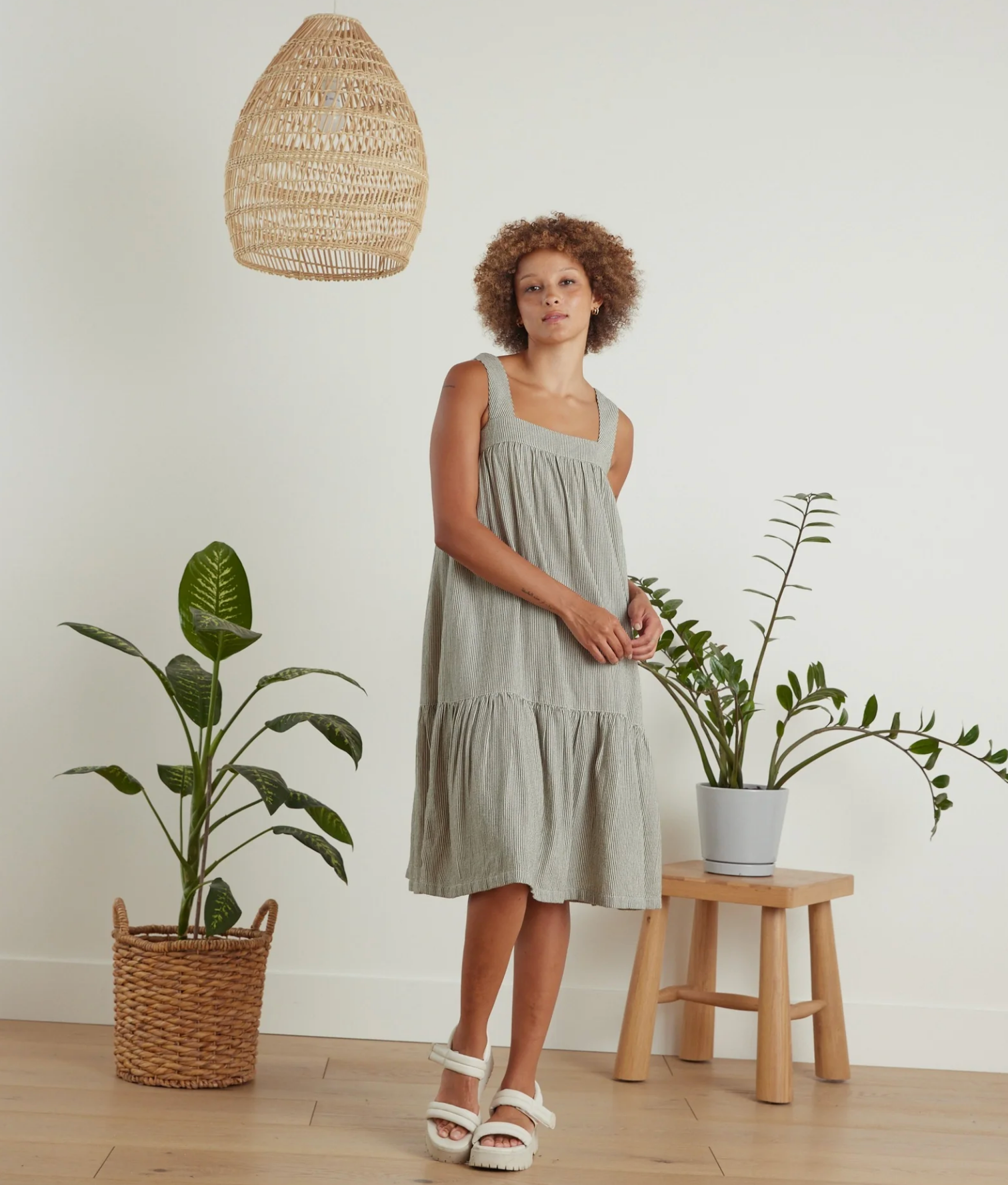Perfectly flowing woven dress for warmer months & locations. The thin stripe in the fabric give this style a an elevated look & feel.