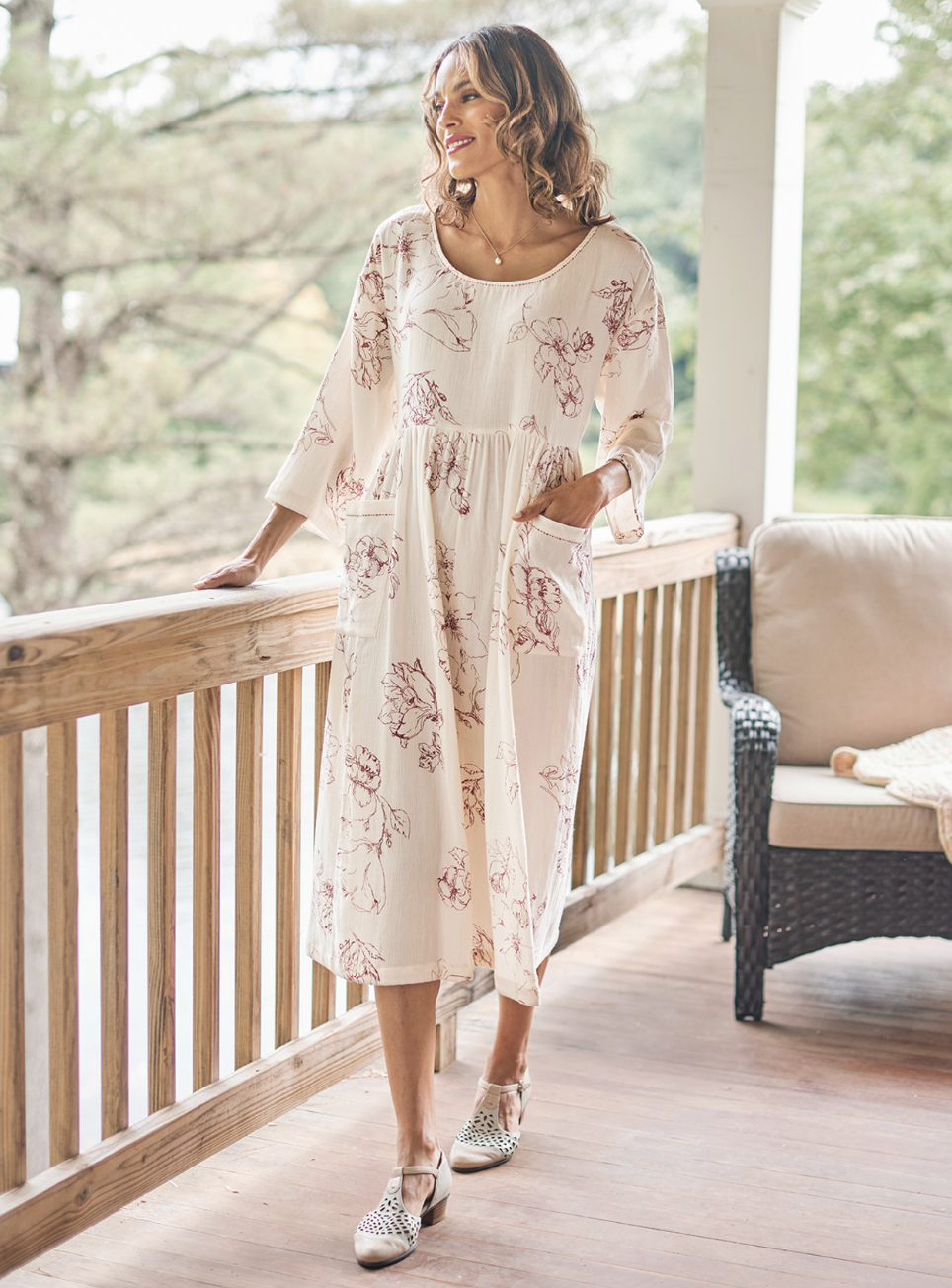 Fresh from the artist's imagination, April's Rose inhabits the essence of flowers on a dress of delightful double cotton gauze, with sweet stitching details and pockets.