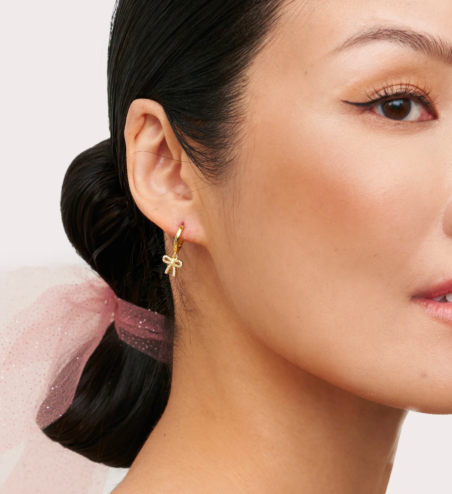 Our Baby Bow Hoop Earrings bring a touch of charm to any look. Available in sterling silver and 14k gold vermeil, these 12mm hoops feature a dainty, dangly bow that creates an elegant yet fun-loving vibe. White crystal details enhance the eye-catching nature of these bows. The clean hoop design and unique shape keep them versatile. Enjoy stacking or wearing solo.