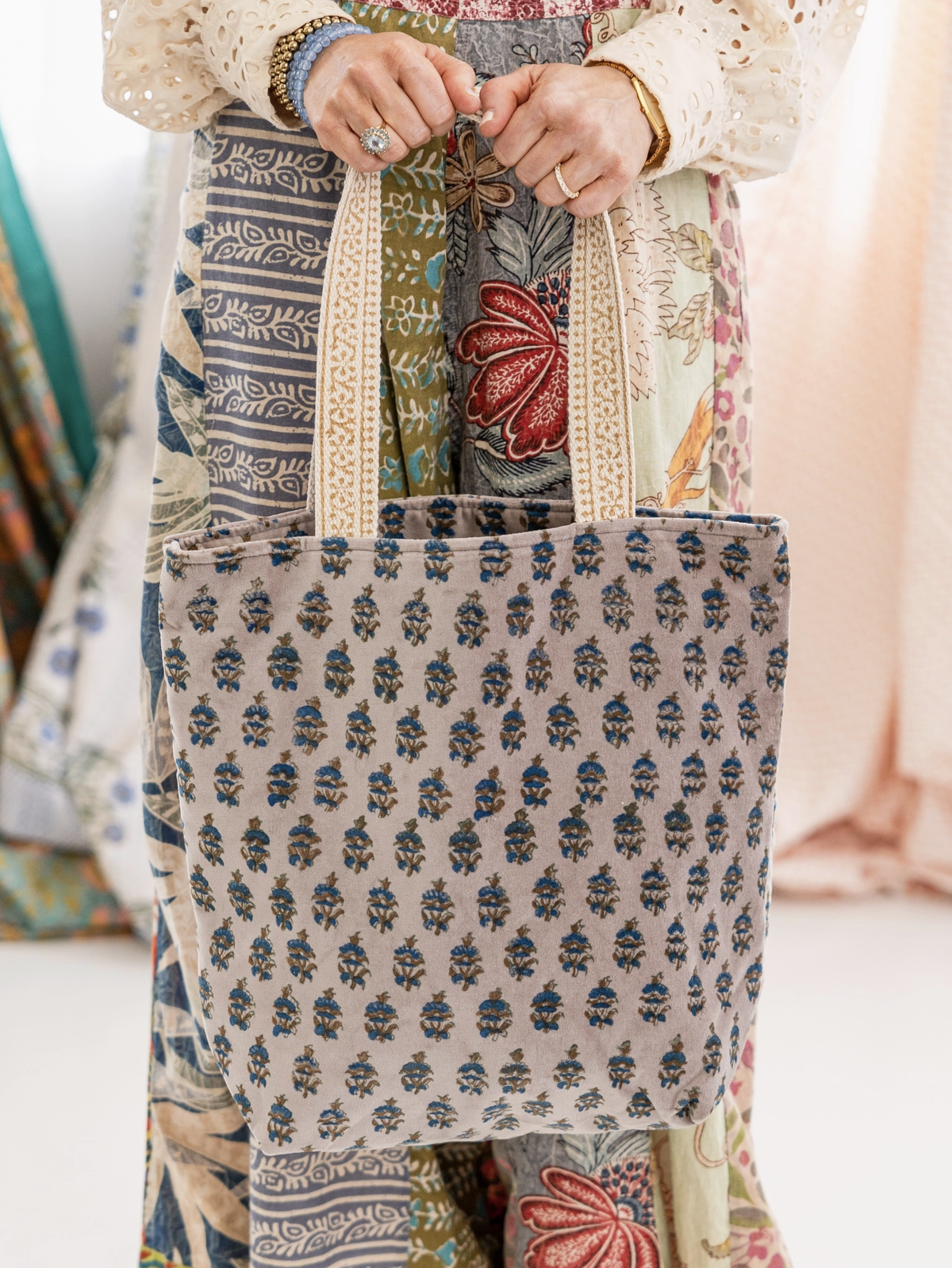 Elevate your everyday style with this sophisticated velvet tote, featuring an eye-catching block print pattern and sturdy, coordinating handles. Handmade in the culturally rich region of Rajasthan, India, this tote is a tribute to centuries-old artisan traditions, brought to life through vibrant hues and intricate hand block printing.