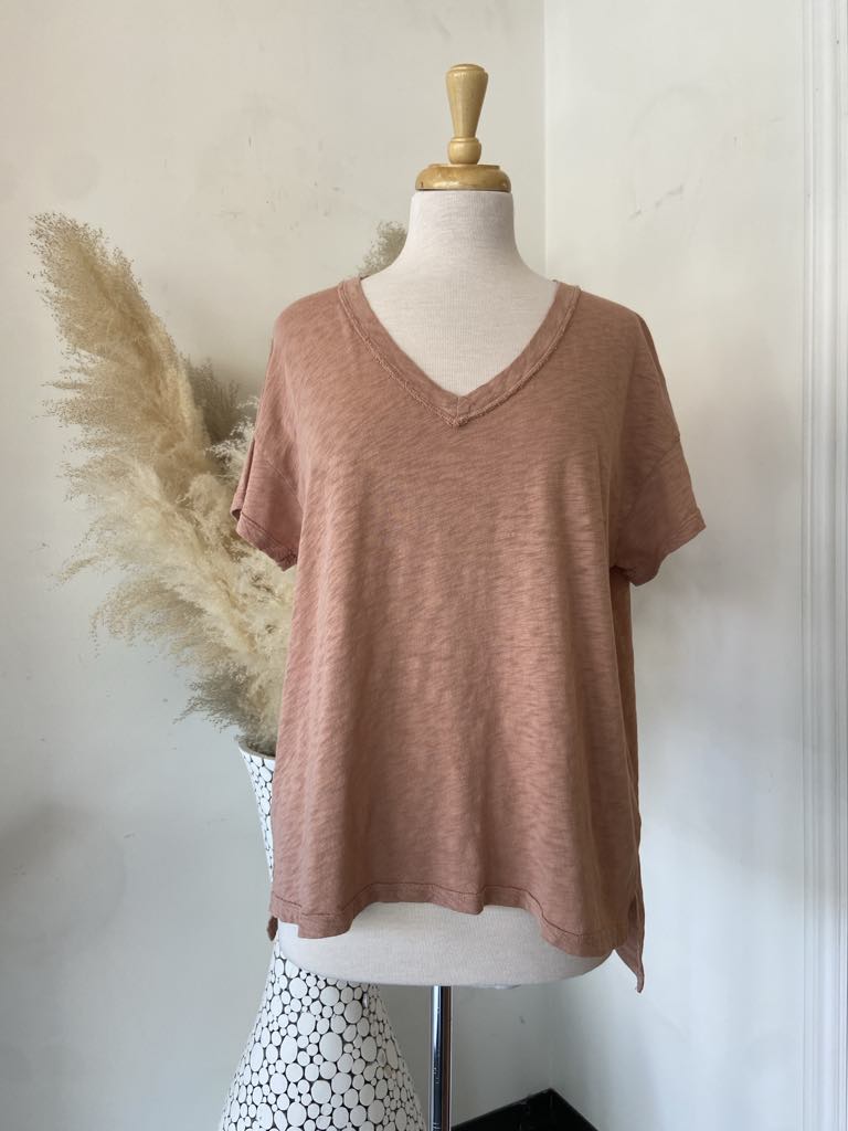 The short sleeve cotton slub tee has a relaxed "boyfriend fit". Raw edge details around the neckline, sleeve and hem add to the relaxed nature of this super soft tee.