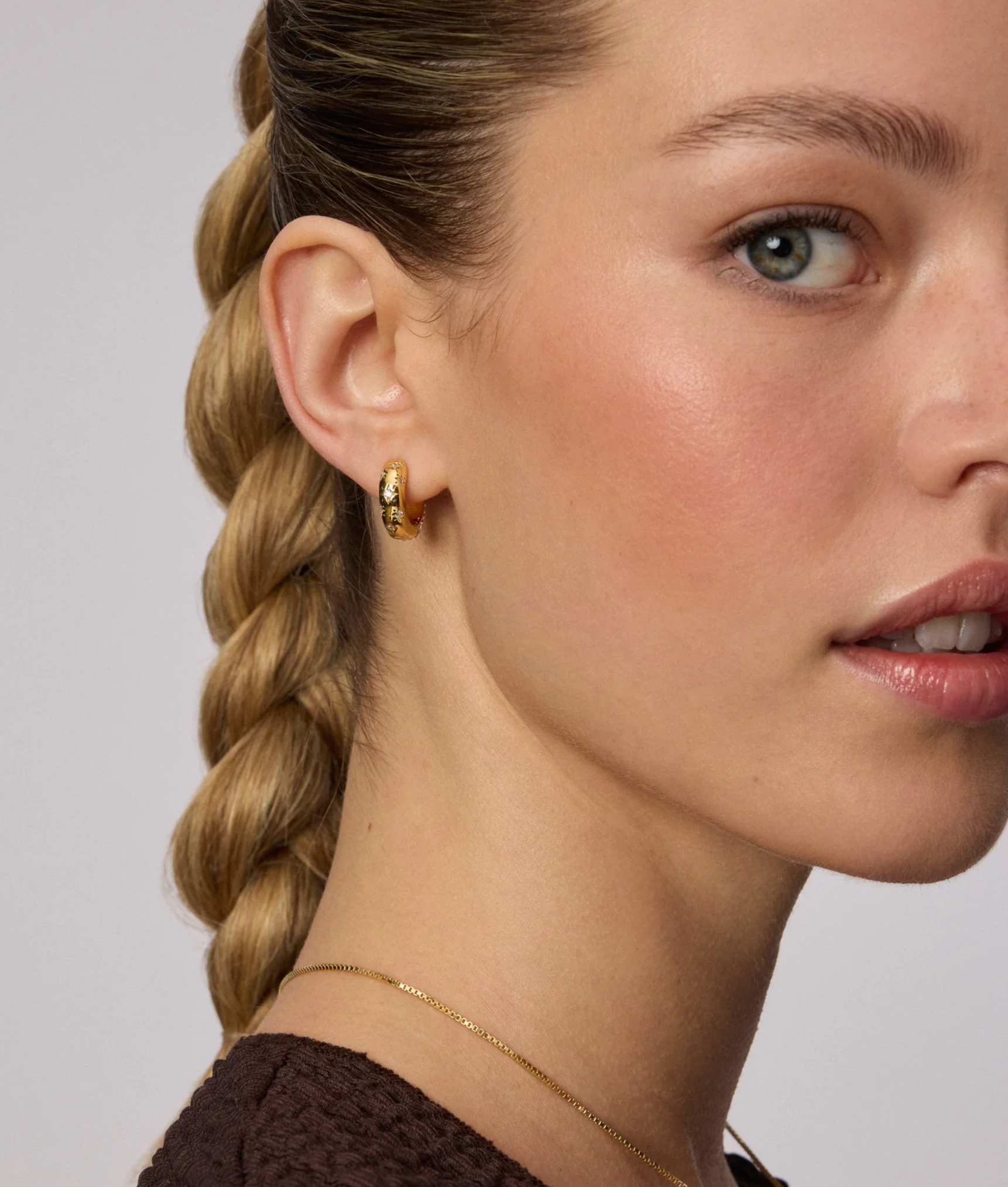 These 16mm reversible hoops deliver double the impact with half the effort. One side features our custom Champagne Sparkle—golden, luminous, and undeniably striking. Flip them over to reveal polished metal etched with radiant crystal starbursts. Lightweight and easy to wear, these hoops offer two elevated looks in one silhouette. Whether you’re dressing for golden hour or a starlit night, these earrings are ready to rise to the occasion.