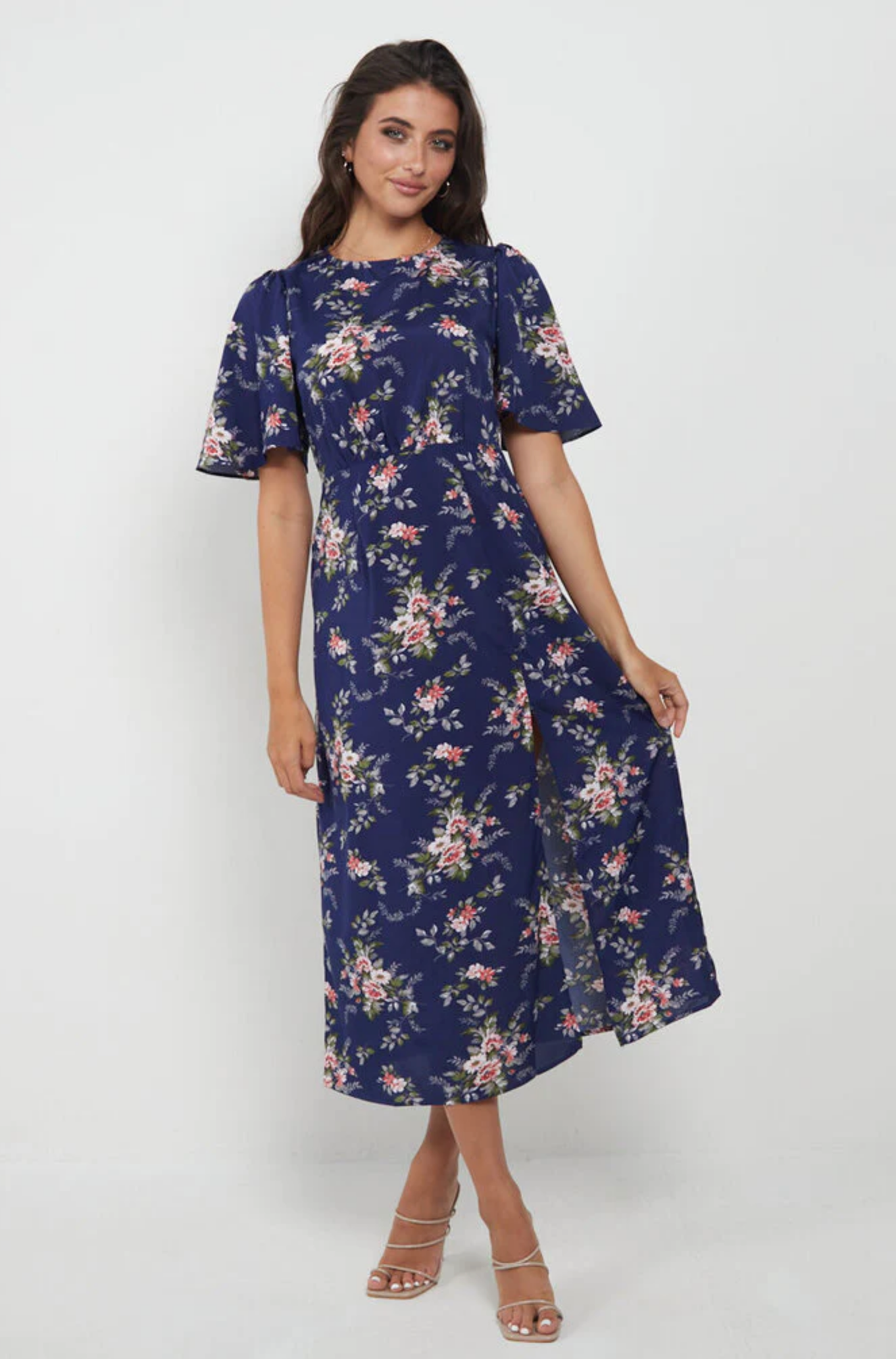 Who doesn't love a nod to bygone days in a lovely floral?? A high neck offers modesty while the thigh split gives some needed edge! Midi length with short sleeves.