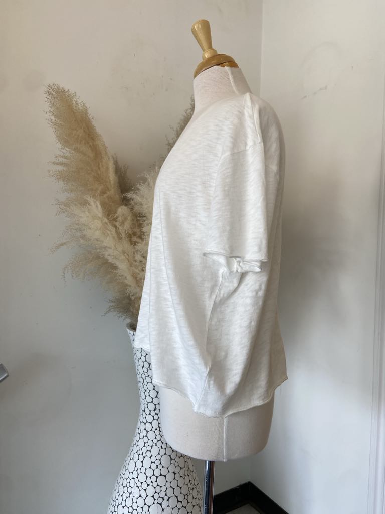 The short sleeve cotton slub tee has a relaxed "boxy fit". Rolled edge details on the sleeve and hem add to the relaxed nature of this super soft tee.