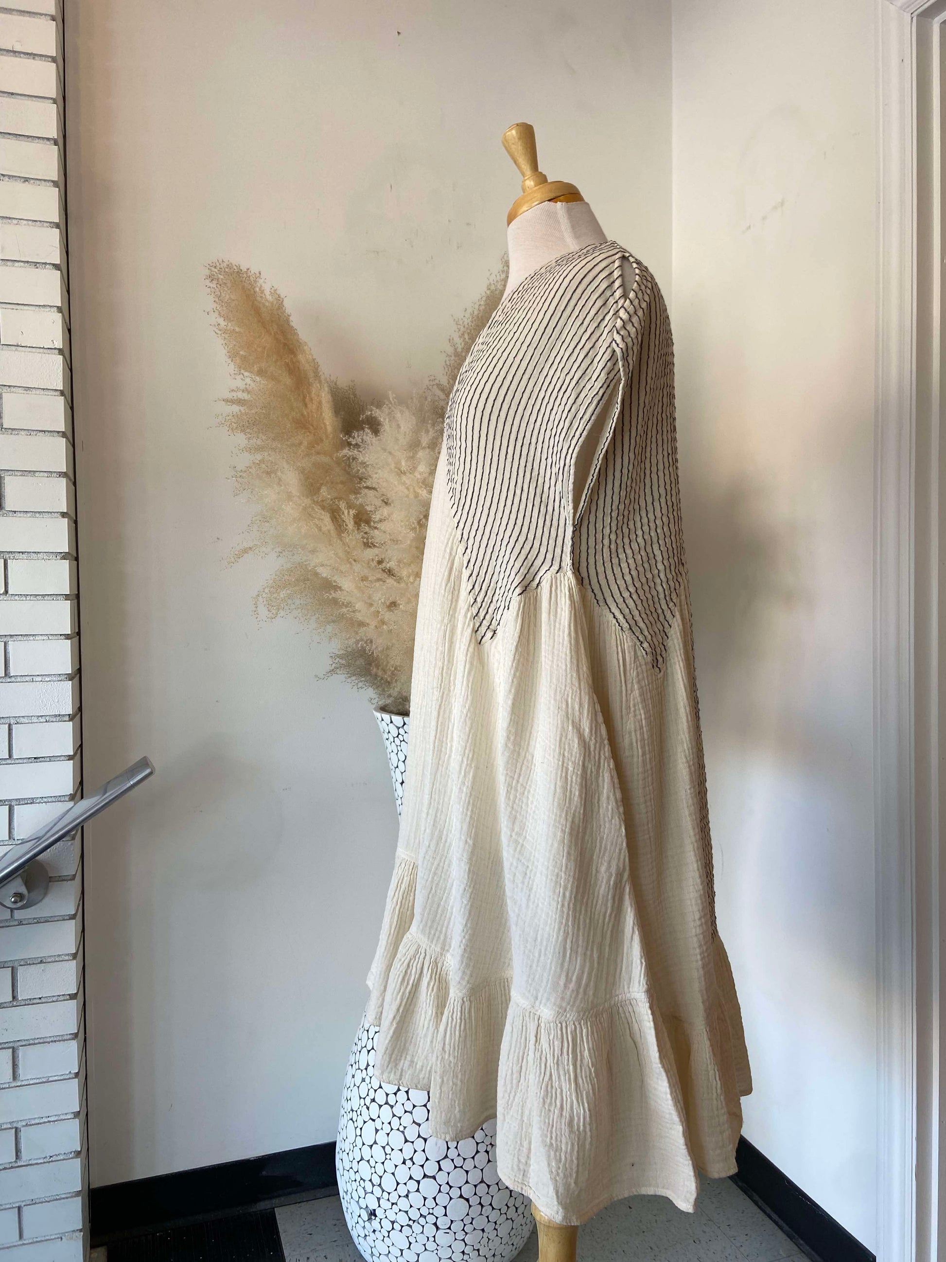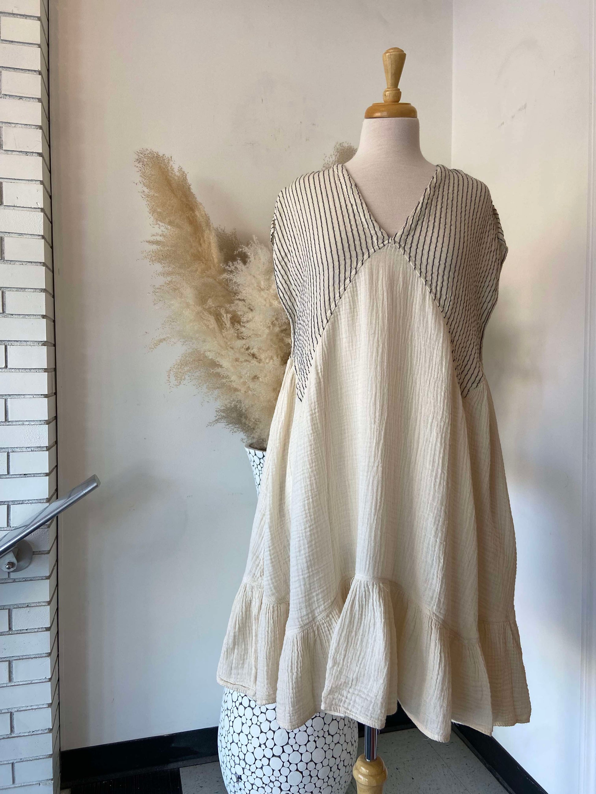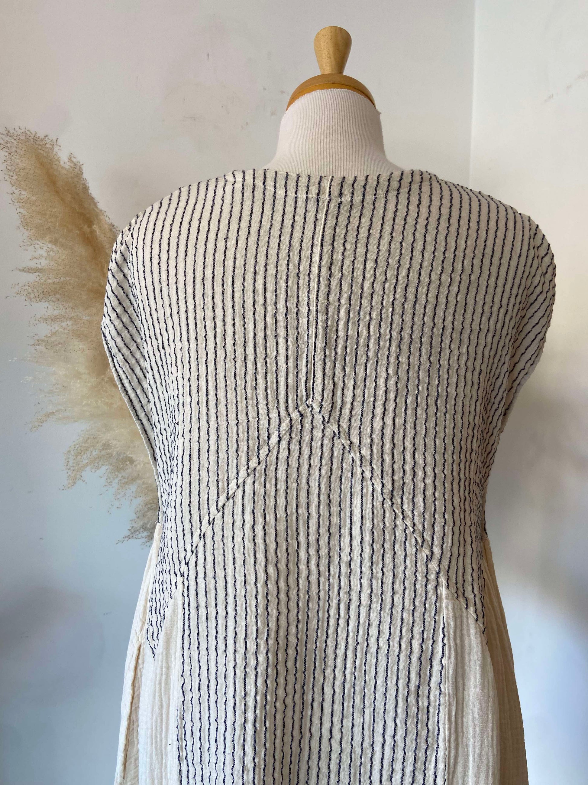 Our Cotton Gauze fabric is made of soft 100% natural cotton fibers that make it breathable, hypoallergenic and light-weight. It is woven using a special technique that involves twisting horizontal warp threads around the vertical weft threads, resulting in a soft, crinkled, and loosely-woven texture with a slight vertical stretch and now we introduce it with a perfect new pin stripe. We focus on having minimal environmental impact by carefully selecting materials like this Cotton Gauze, as it is a wonderful long-lasting material and local to our artisan maker’s.