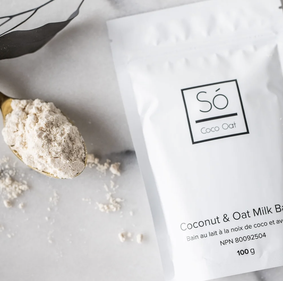 Só Luxury's Coco Oat Milk Bath is natural and free of all nasties (toxins, parabens and carcinogens). An officially licensed, natural health product that is recognized by Health Canada as having therapeutic qualities and as a safe and effective product for treating eczema and other skin conditions. Protects and helps relieve minor skin irritation and itching due to rashes and eczema. Relieves dry skin, protects against and alleviates chapping, cracking and roughness due to dryness.