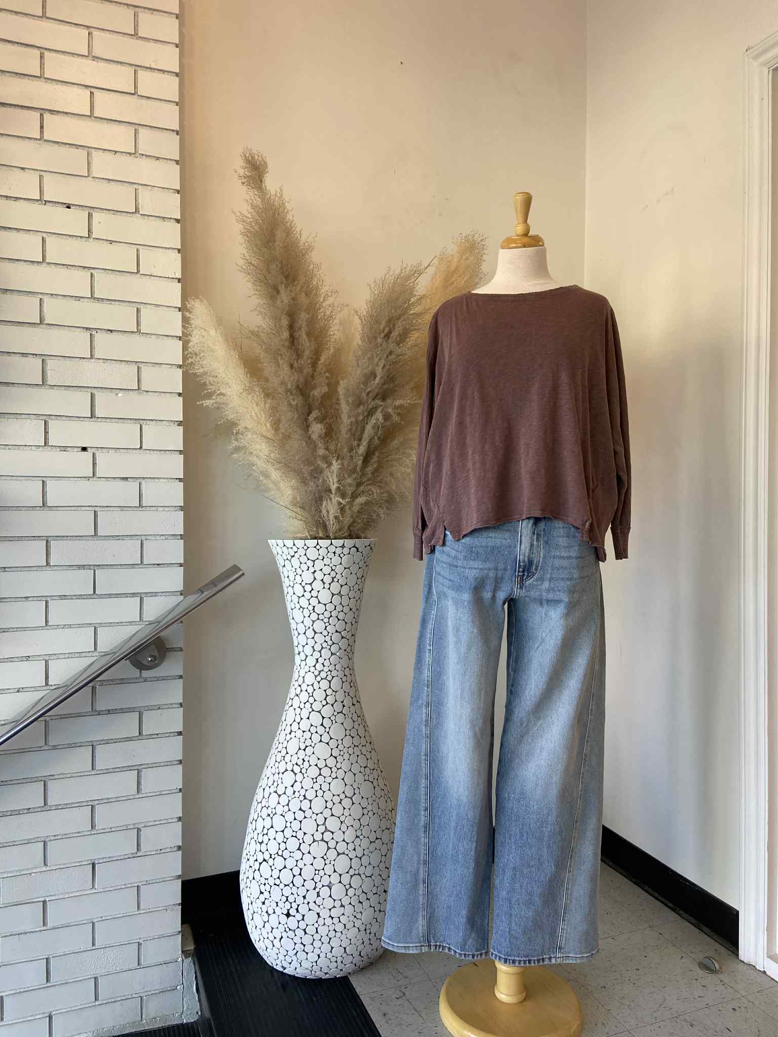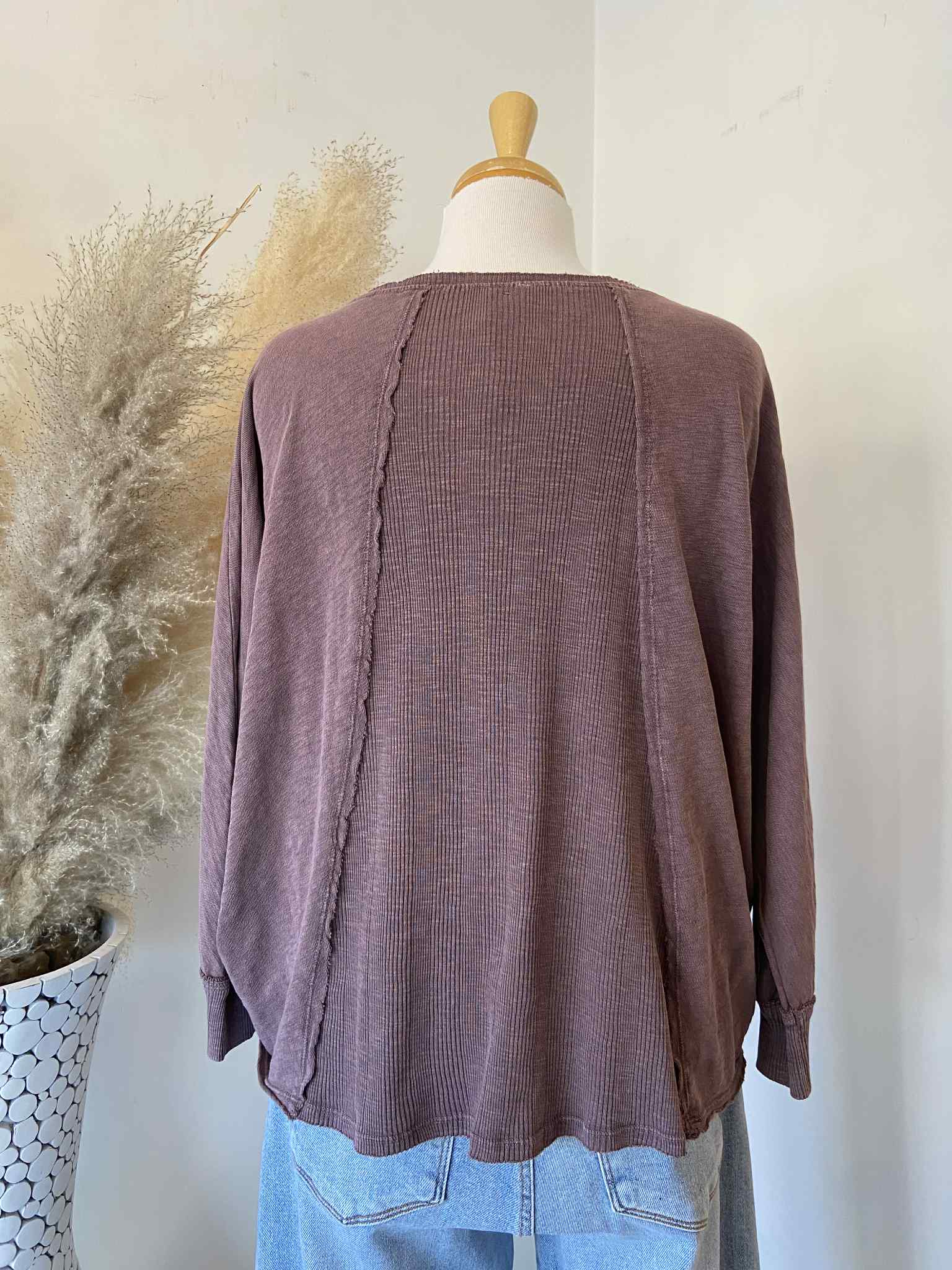 The long sleeve crew neck top in a loose fabric with contrast rib fabric on cuffs, neck and back.