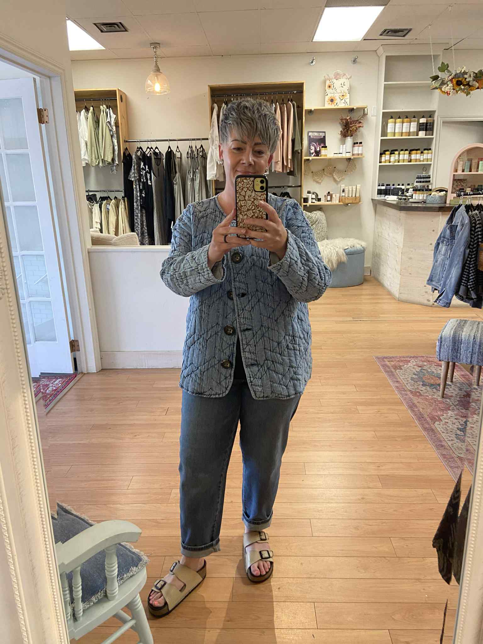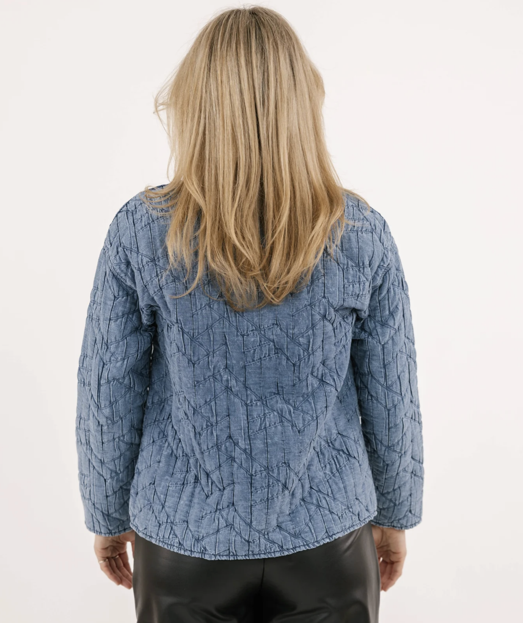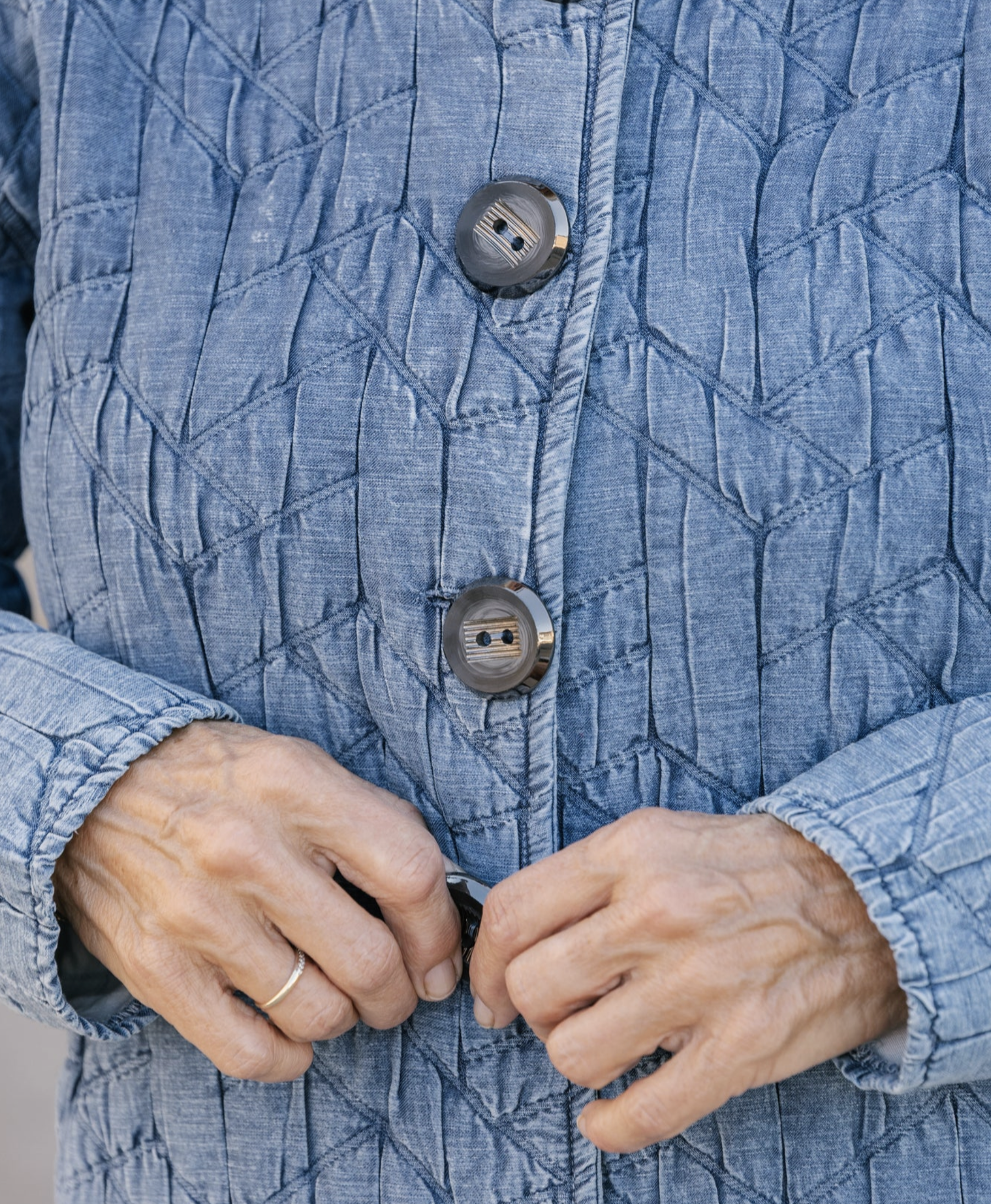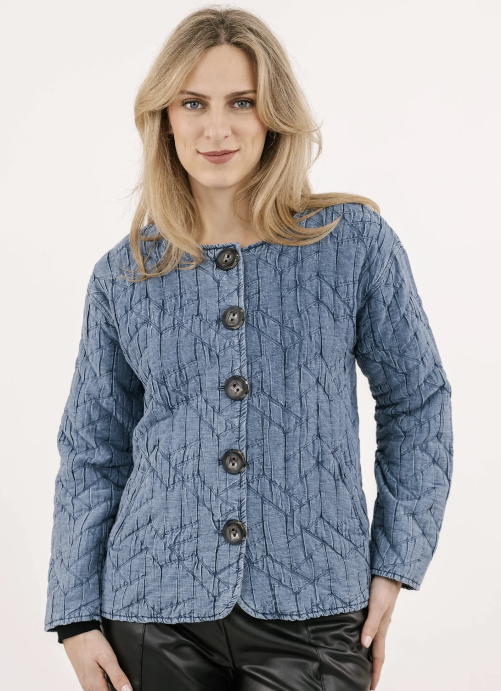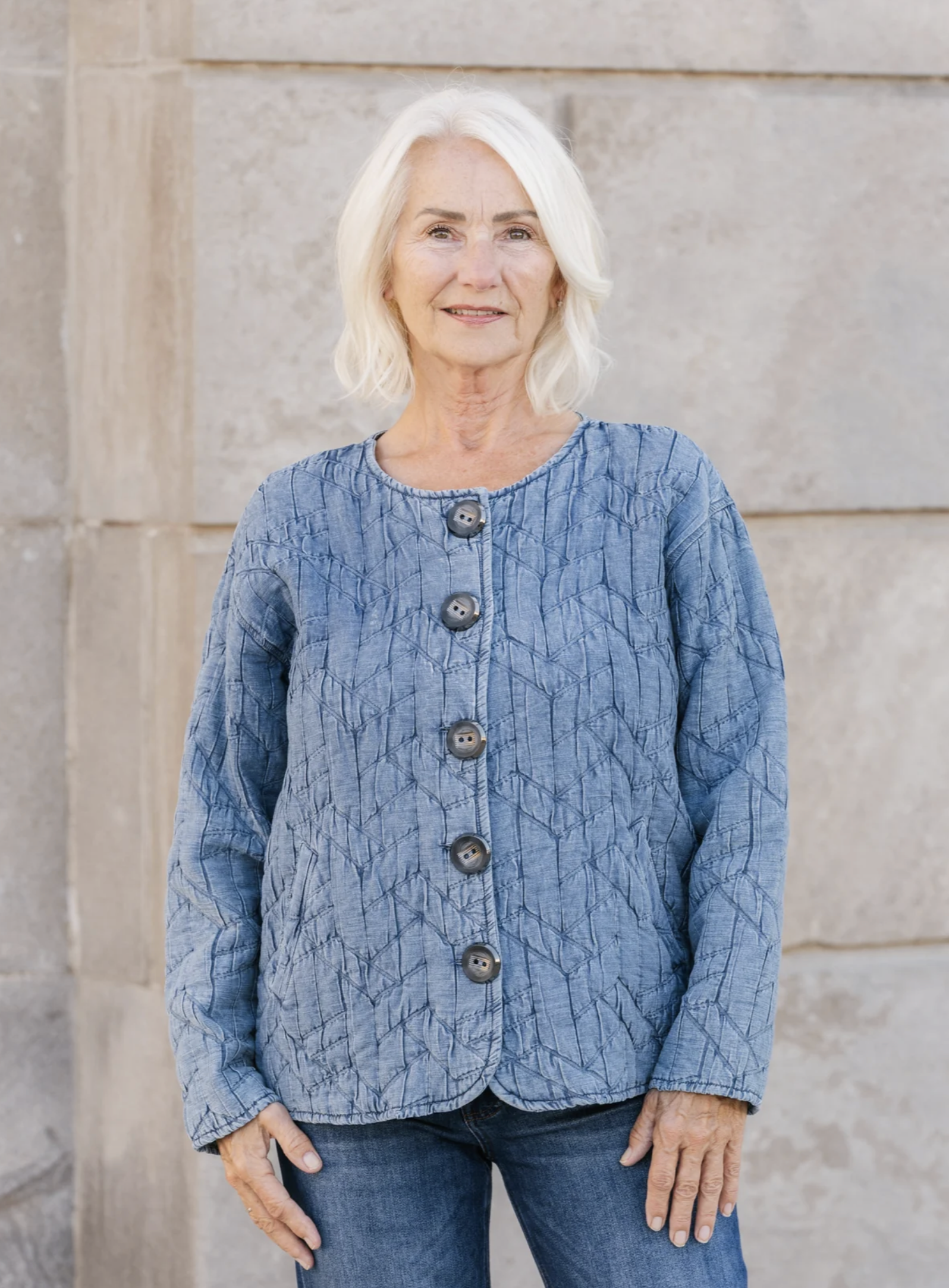 Modern Quilted denim has character. Each piece is stonewashed resulting in a super soft hand. Unique detailed buttons are a signature.