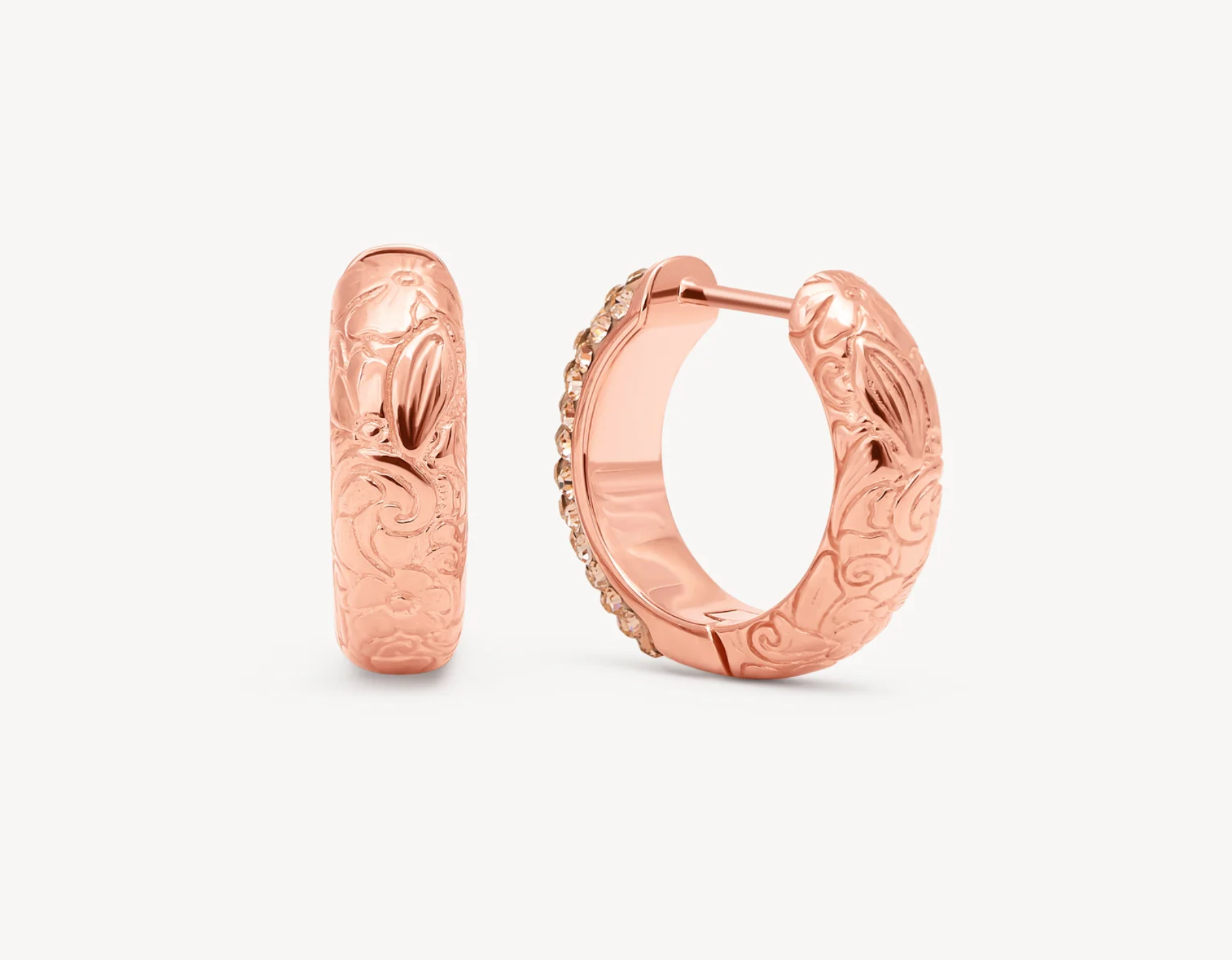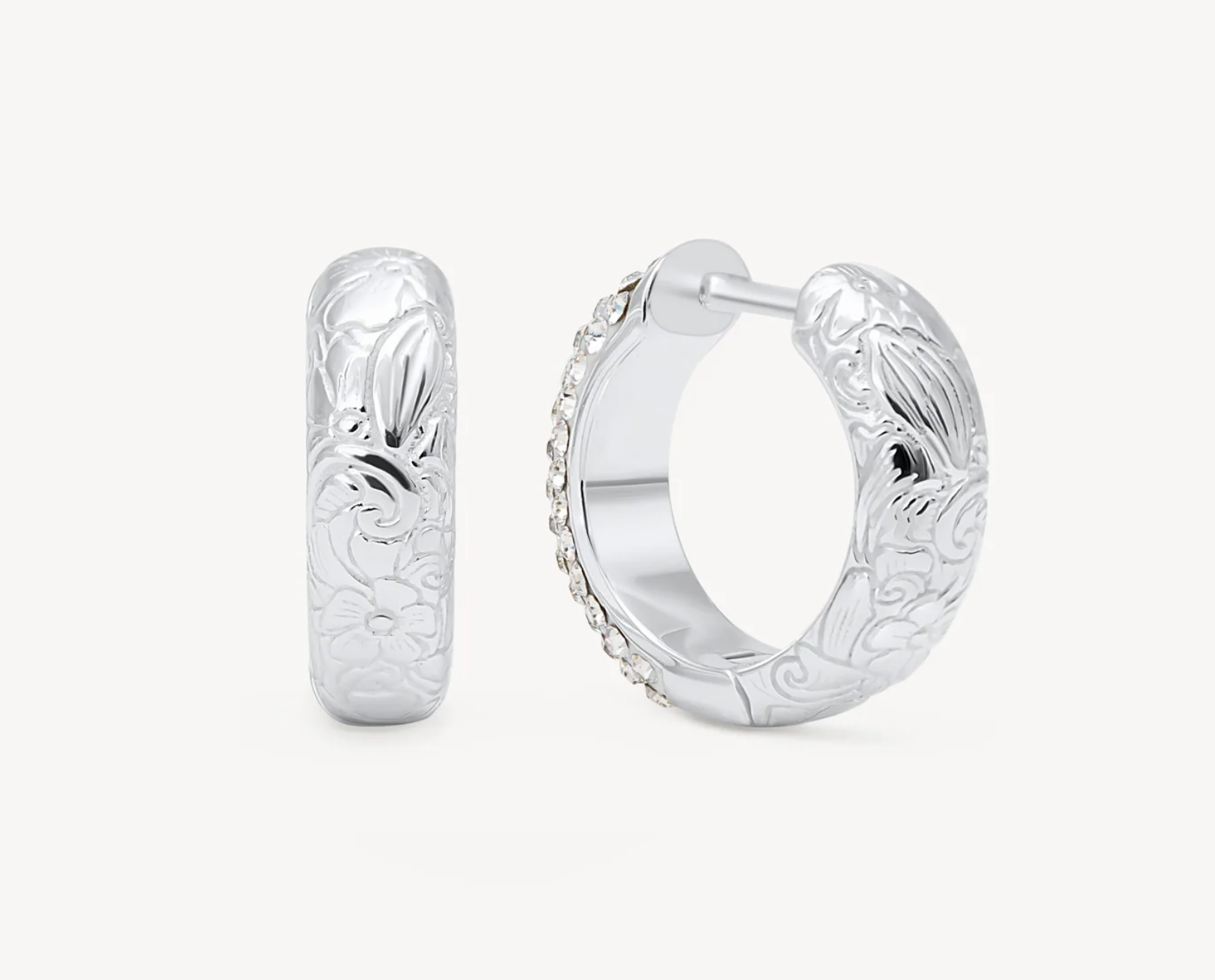 Two textures, one perfect hoop—floral etching and bold sparkle in one seamless silhouette.