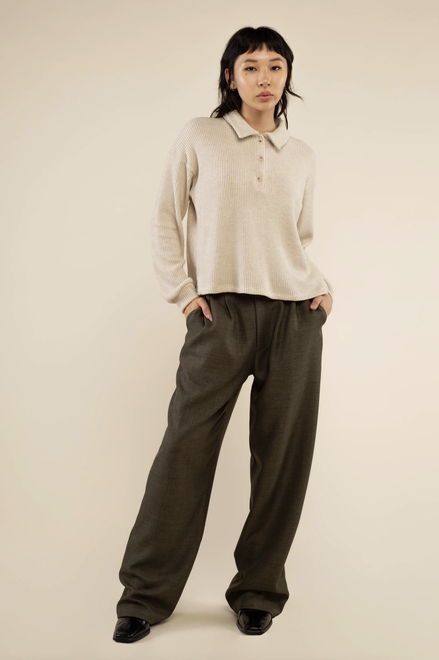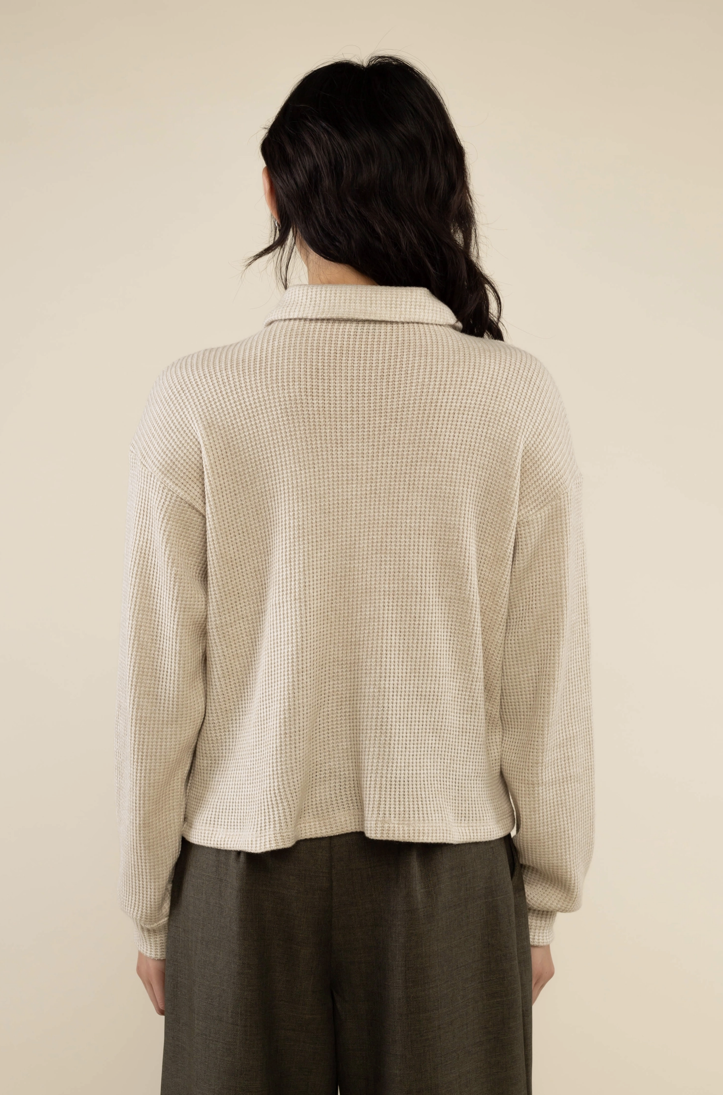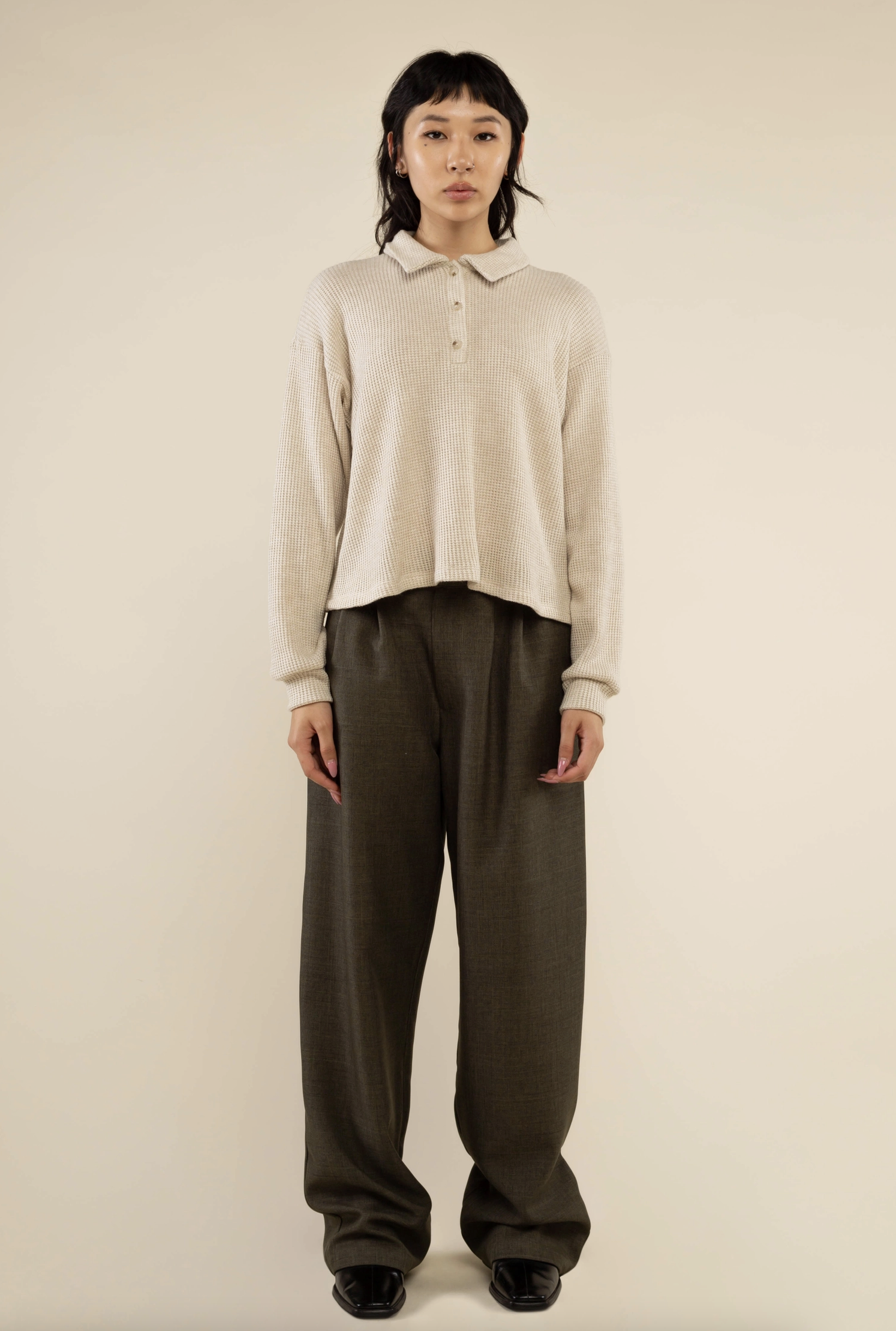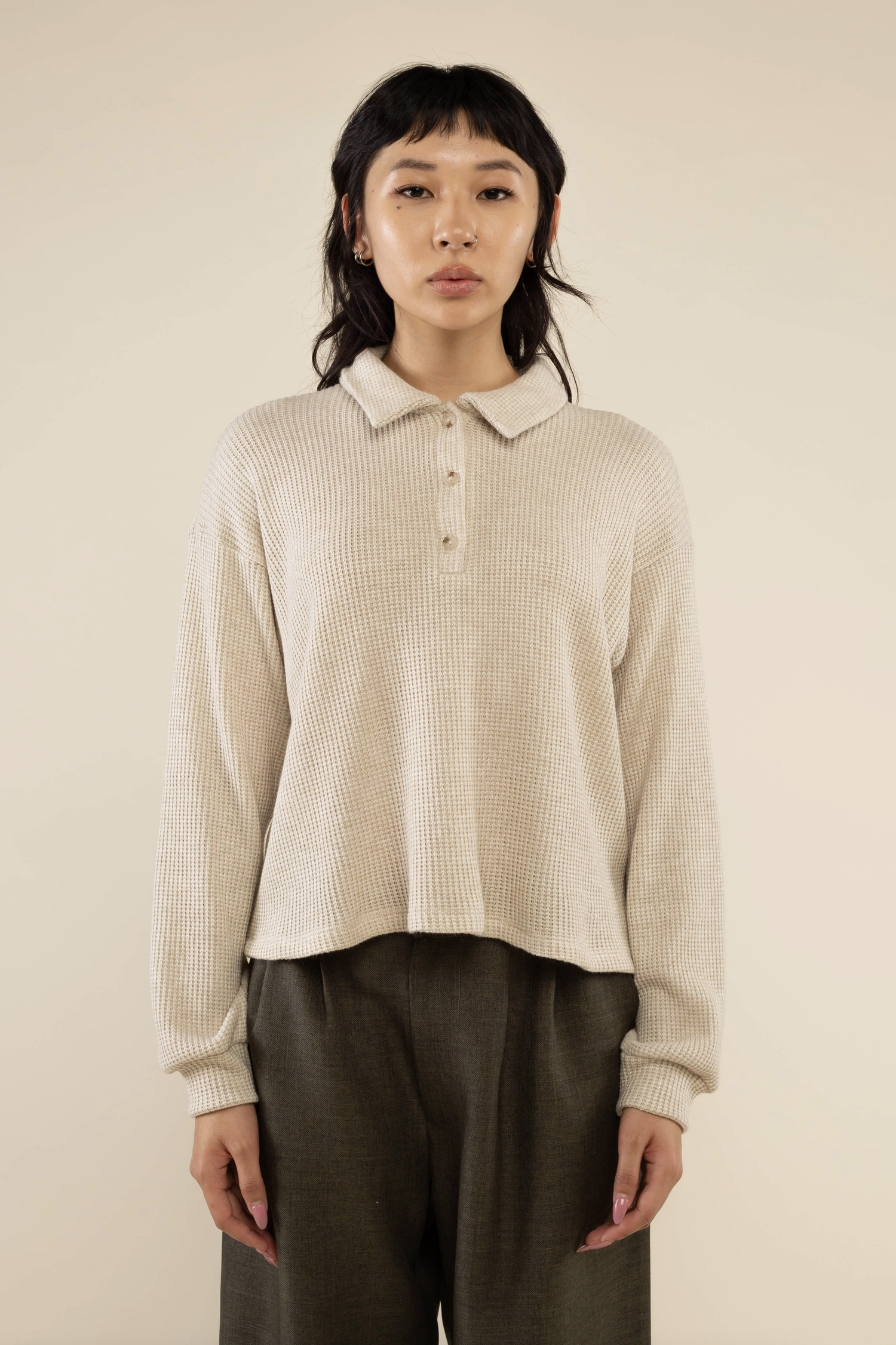 Long sleeve slouchy polo. Fabric is a mid weight soft waffle.