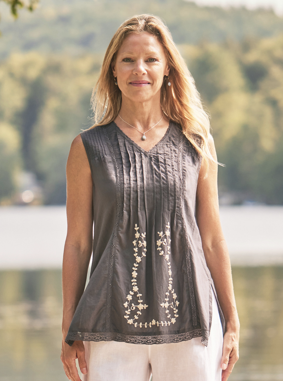Exceptional cotton forms the basis for this darling cami treated to hand-guided ivory embroidery, pretty pintuck pleats, and signature crochet trims.