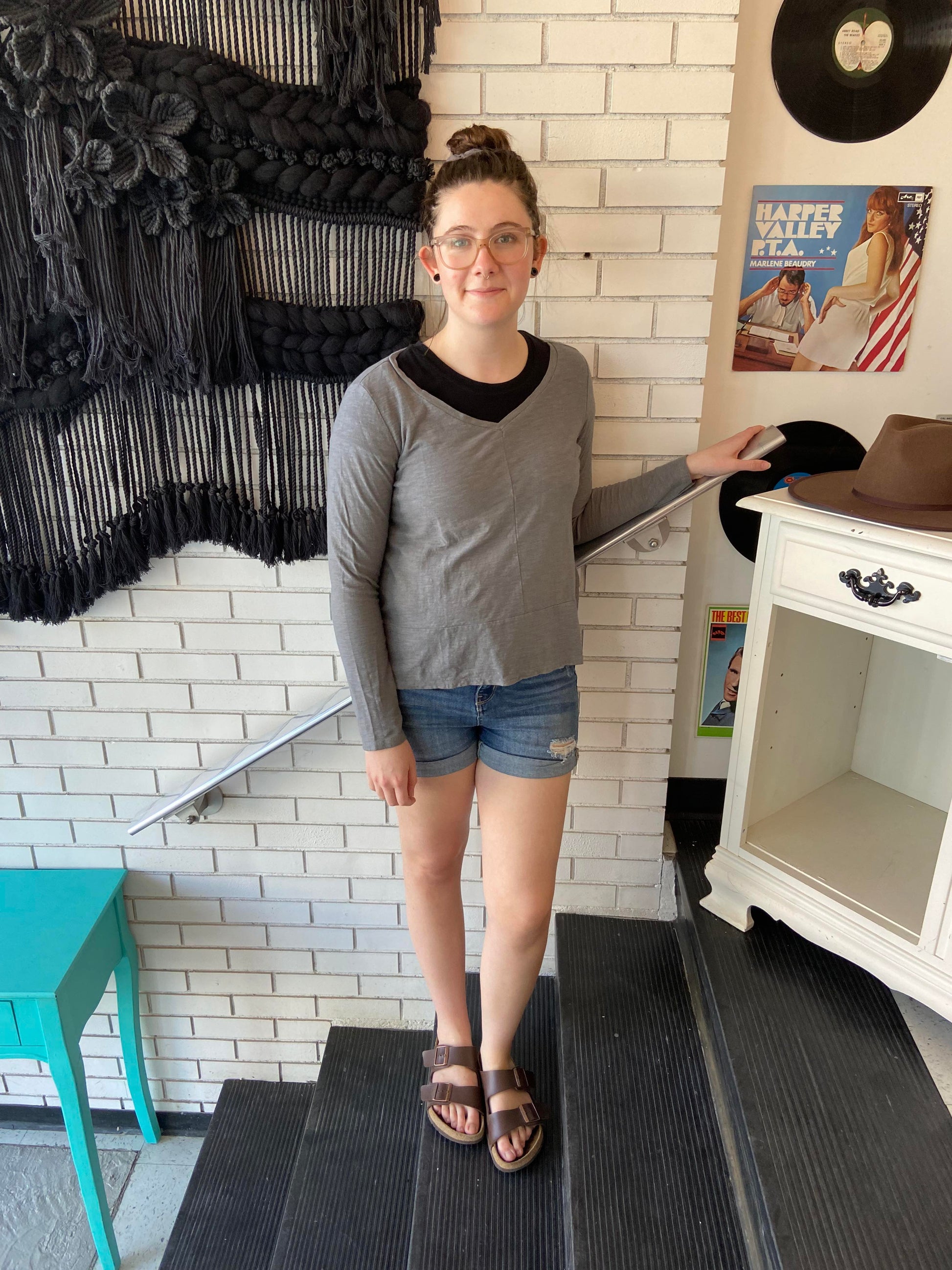 Beautiful top with band detail at the hem. V Neck, little shorter in the front and longer in the back! Made from yummy linen gauze - so expect fabric that is light to wear. Airy weave makes layering easy on warmer days. Not too long, perfect for your jeans or dress pants
