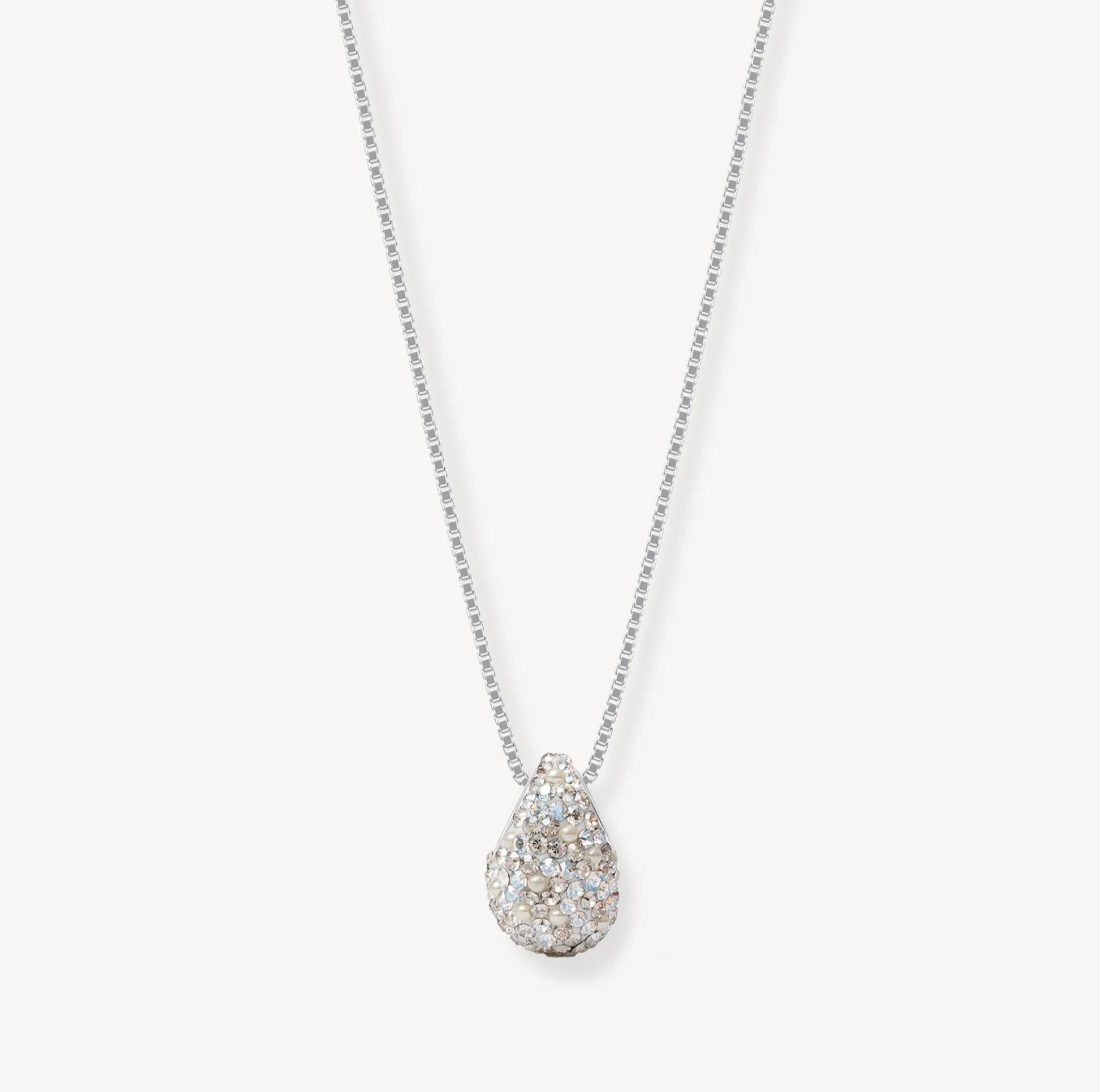 Elegant and versatile, the Glitz Mini Drop Necklace captures light in the most refined way. The sculptural drop charm blends moonlight crystals and delicate white pearls to create a subtle, silvery glow that complements any look. Paired with an adjustable sterling silver box chain, it layers beautifully or stands gracefully on its own. Compact yet full of presence, this limited-edition piece brings quiet radiance and modern sophistication to your everyday rotation.