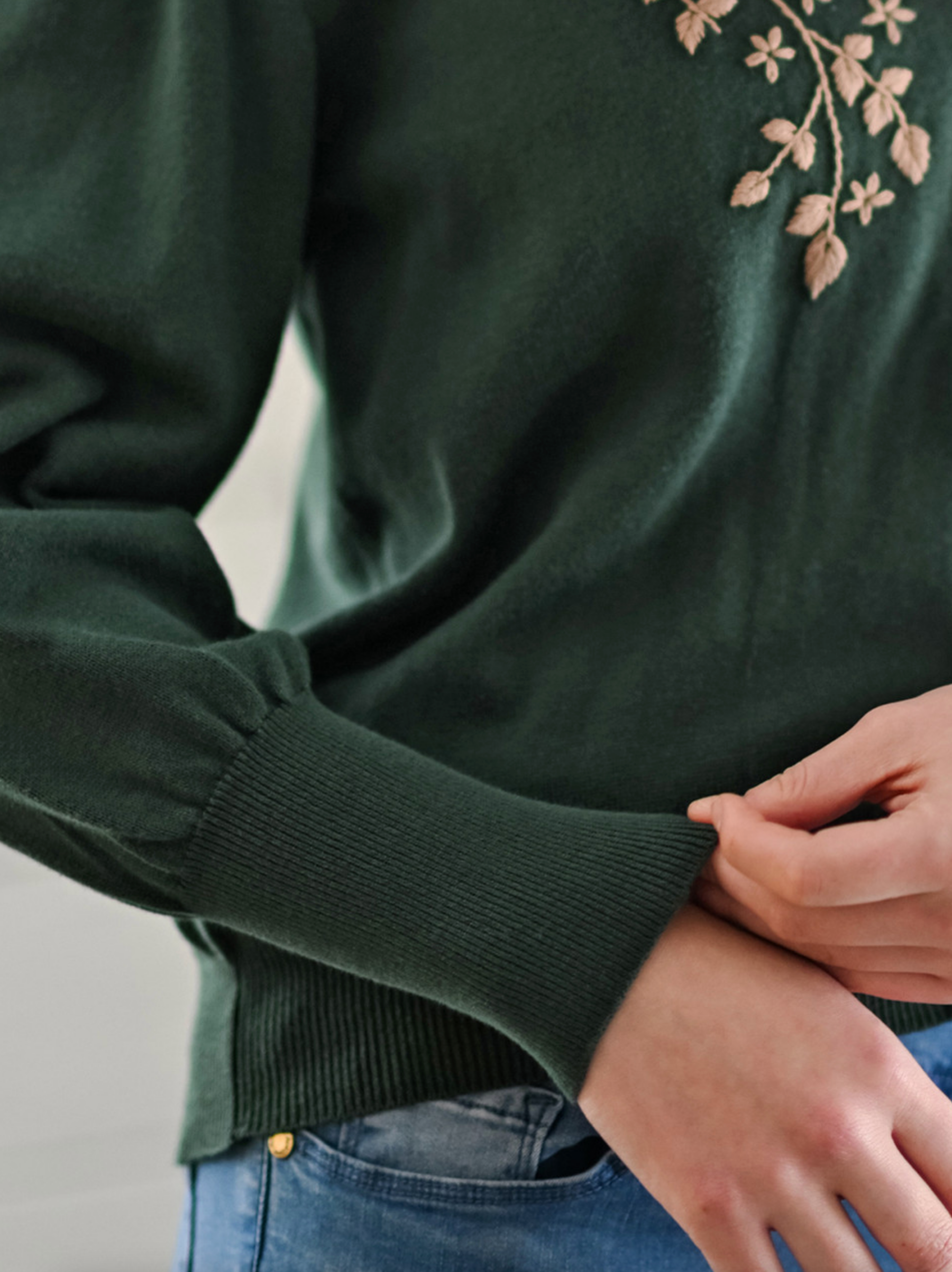 So charming! The Ivy Hollow delights in rich forest green, featuring leafy botanical embroidery, tortoiseshell-style buttons, and rib knit accents at the hem and sleeve cuff.