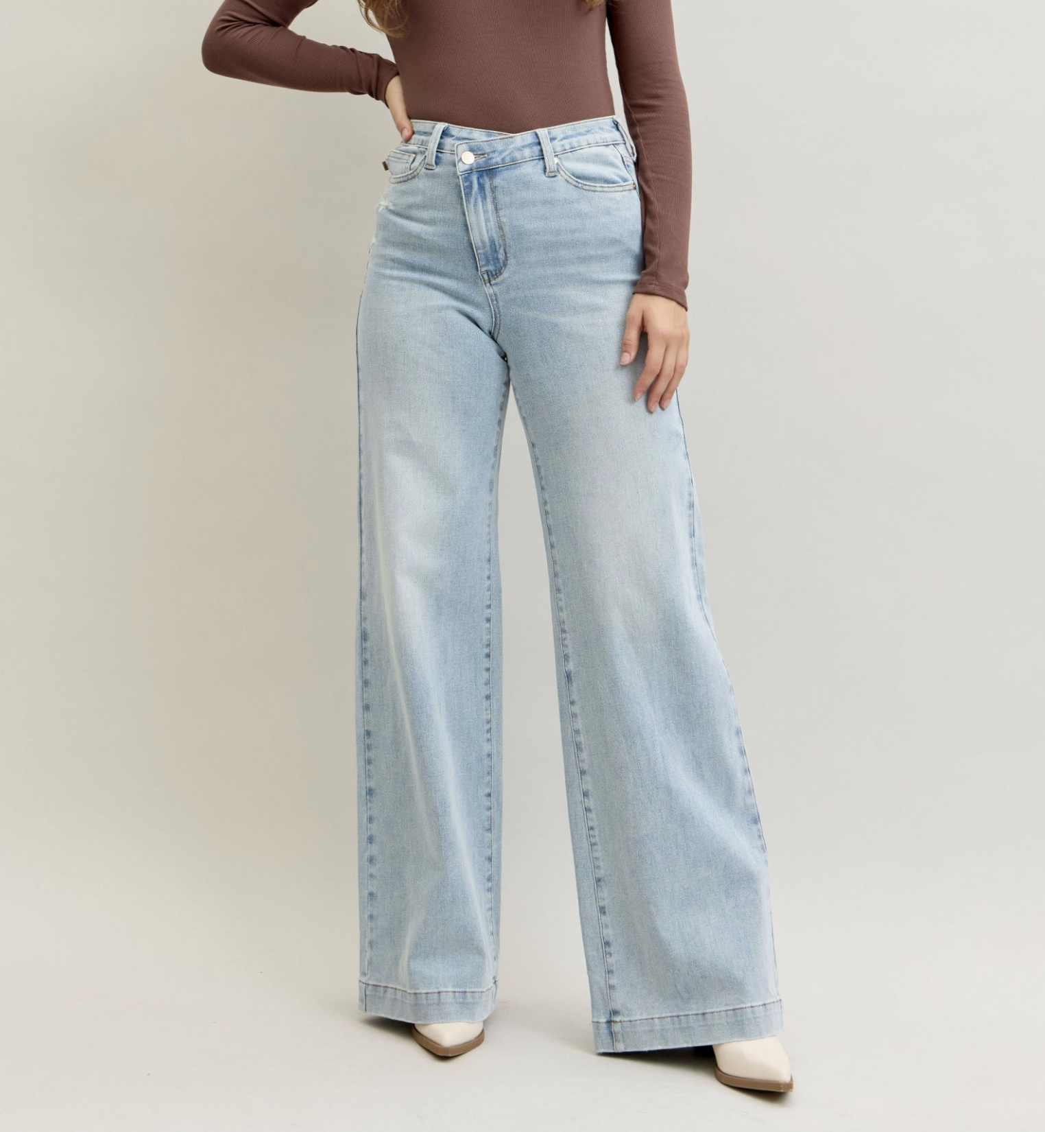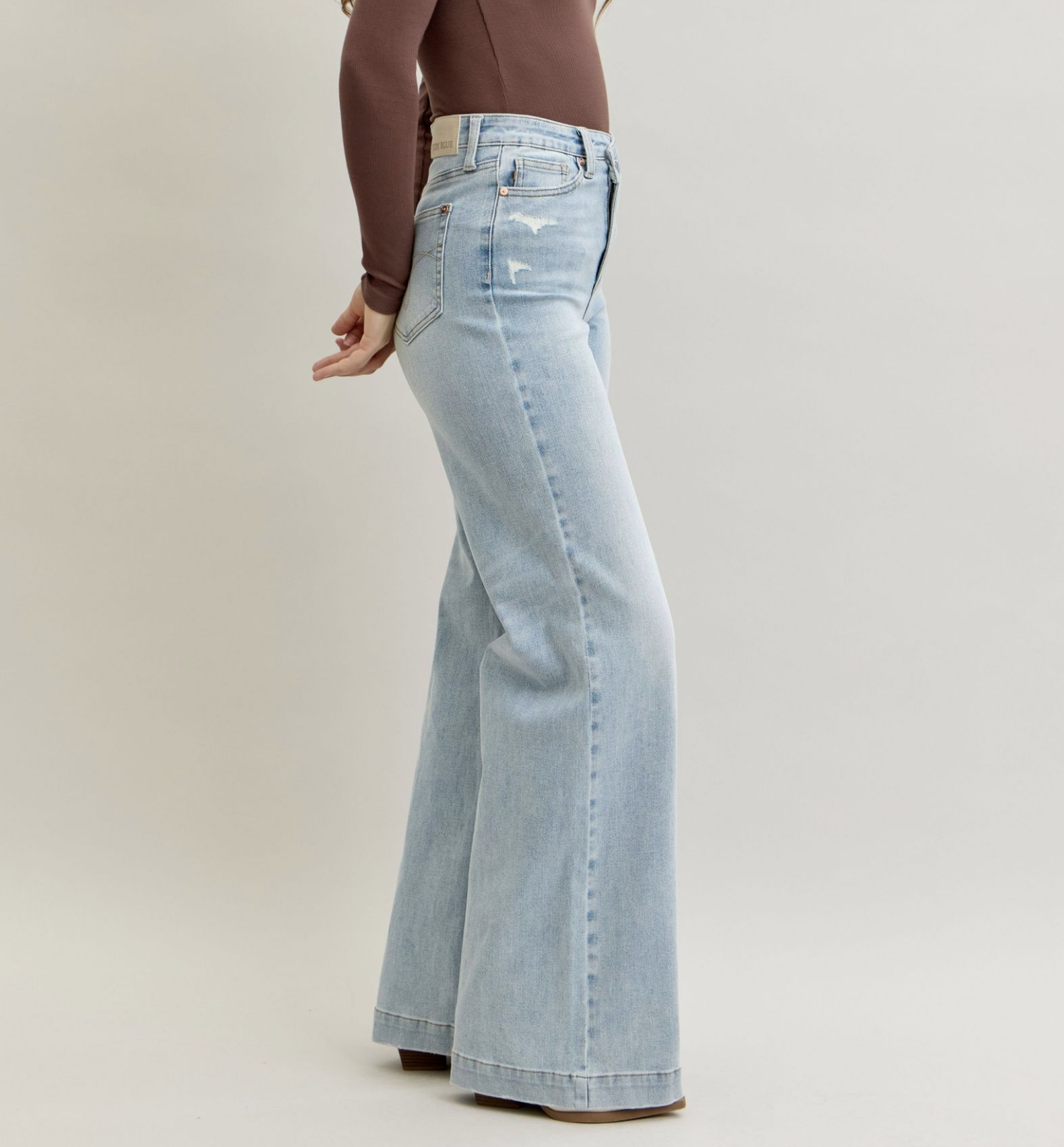 A beautiful wide leg jean in a light wash. Easily passes as a work pant!!
