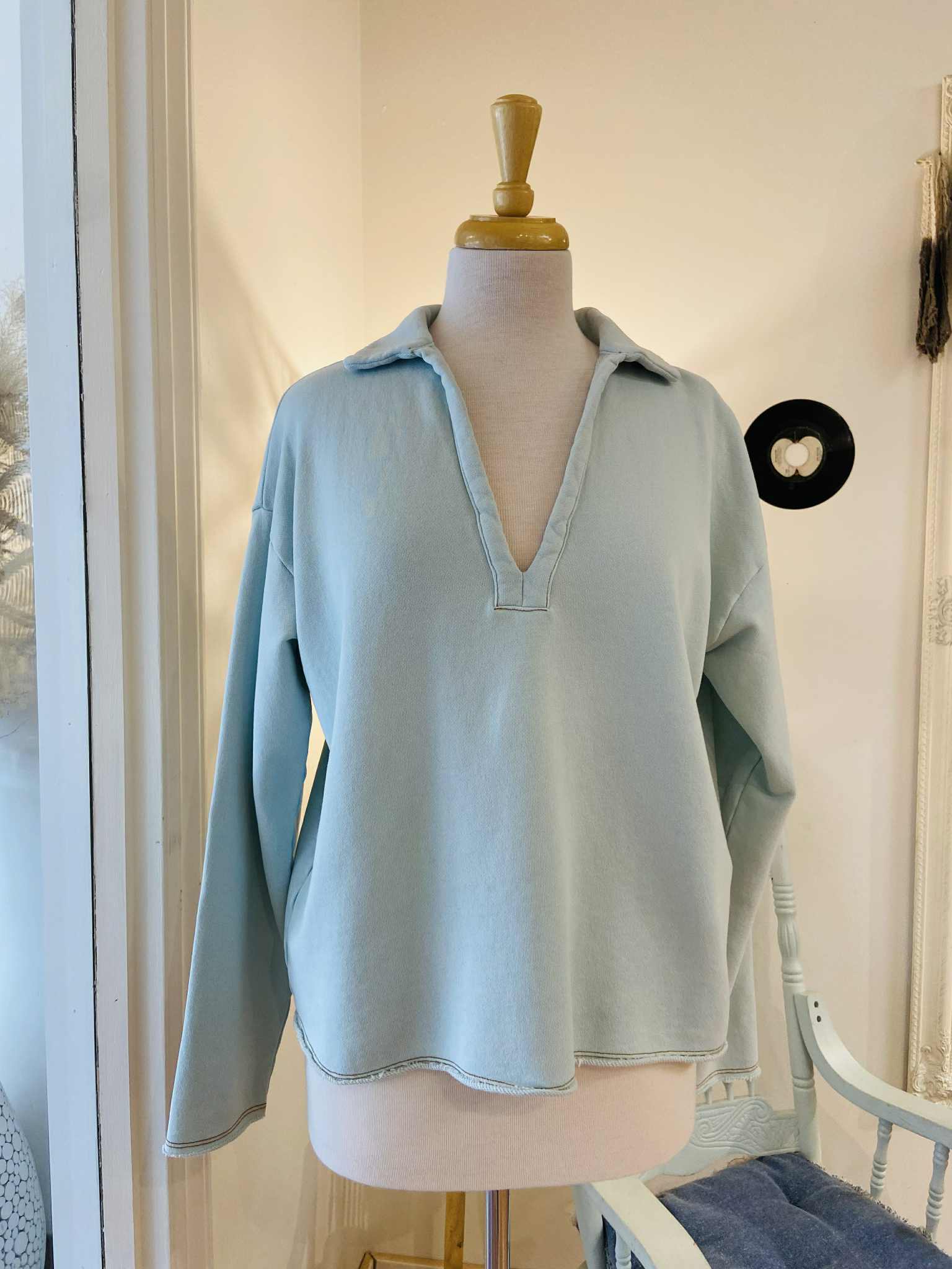 The long sleeve collared "boxy fit" sweatshirt has rolled edge details on the hem and cuff.
