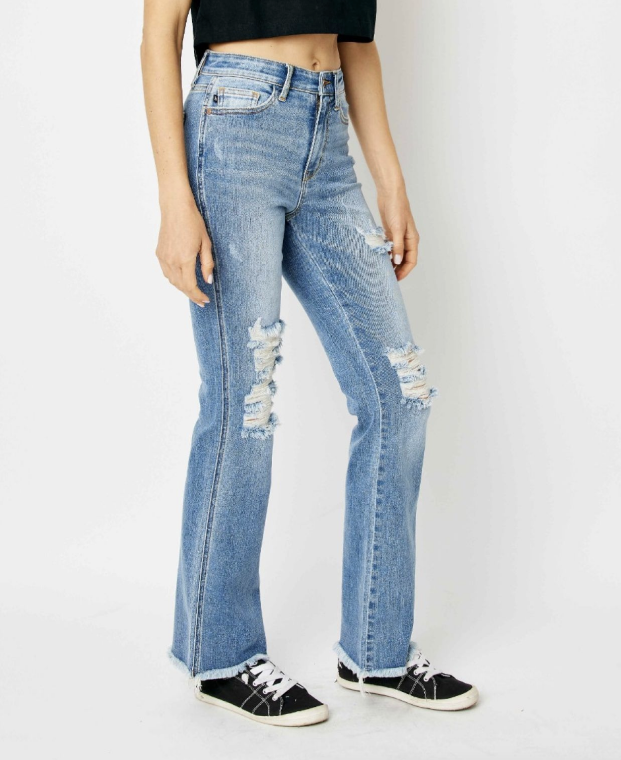 Judy Blue medium wash bootcut jeans featuring a high rise, distressing, and raw edge hem. Soft, comfortable denim with great stretch! Great pair for year round wear. Super cute with booties, or pair with sandals in warmer weather!