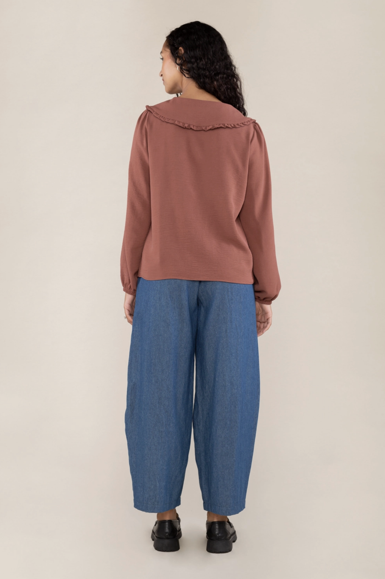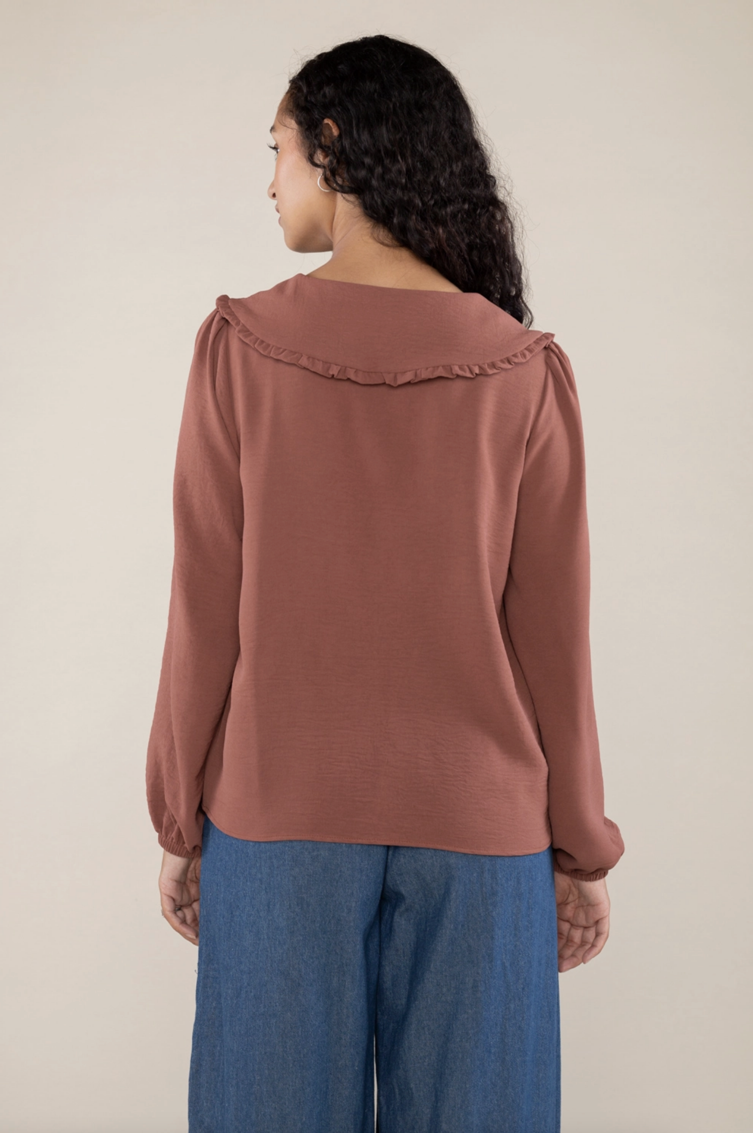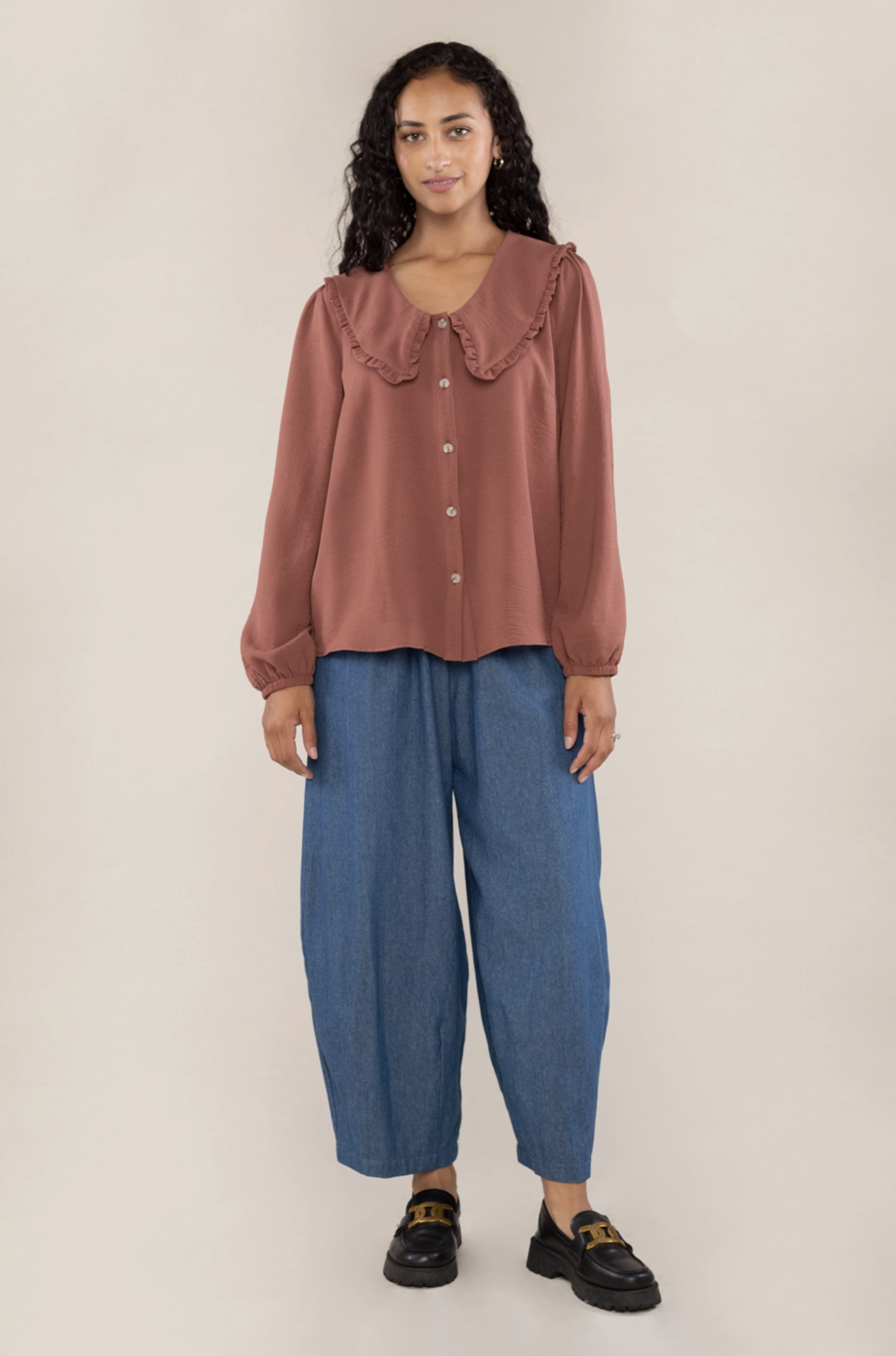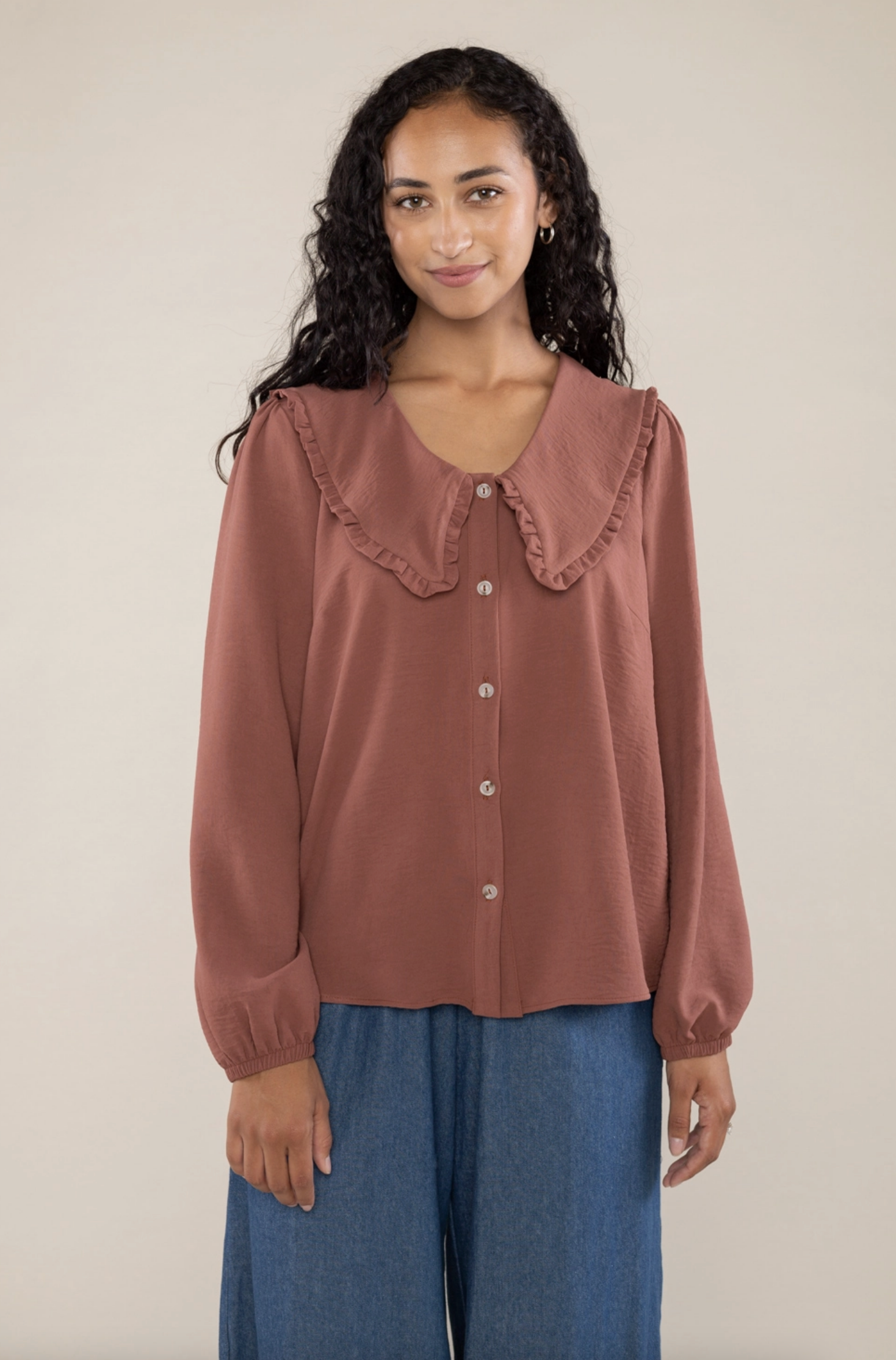 Button up long sleeve blouse with oversized collar with ruffle trim.