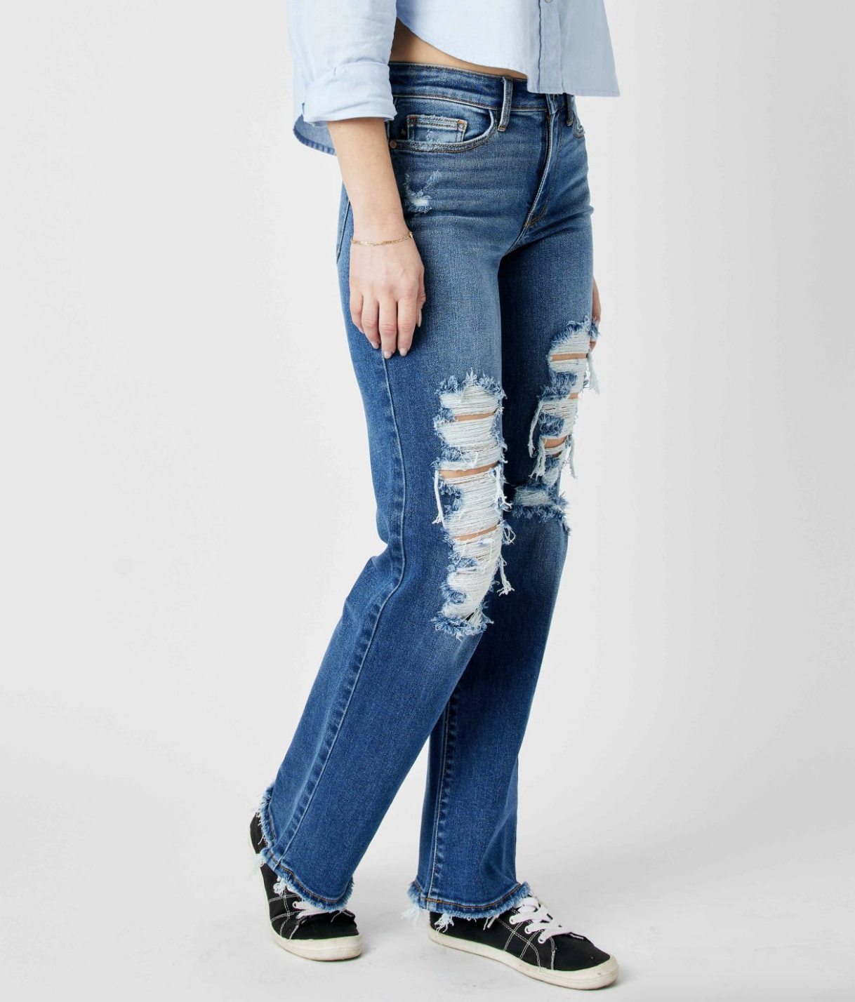 High rise dad jean with distressing.