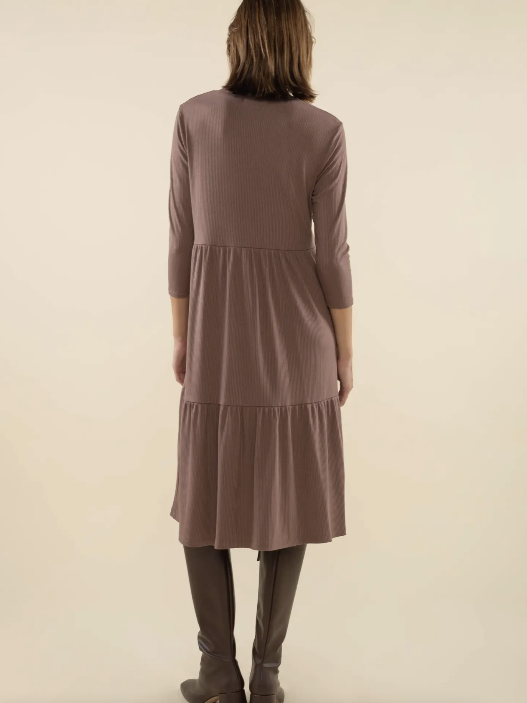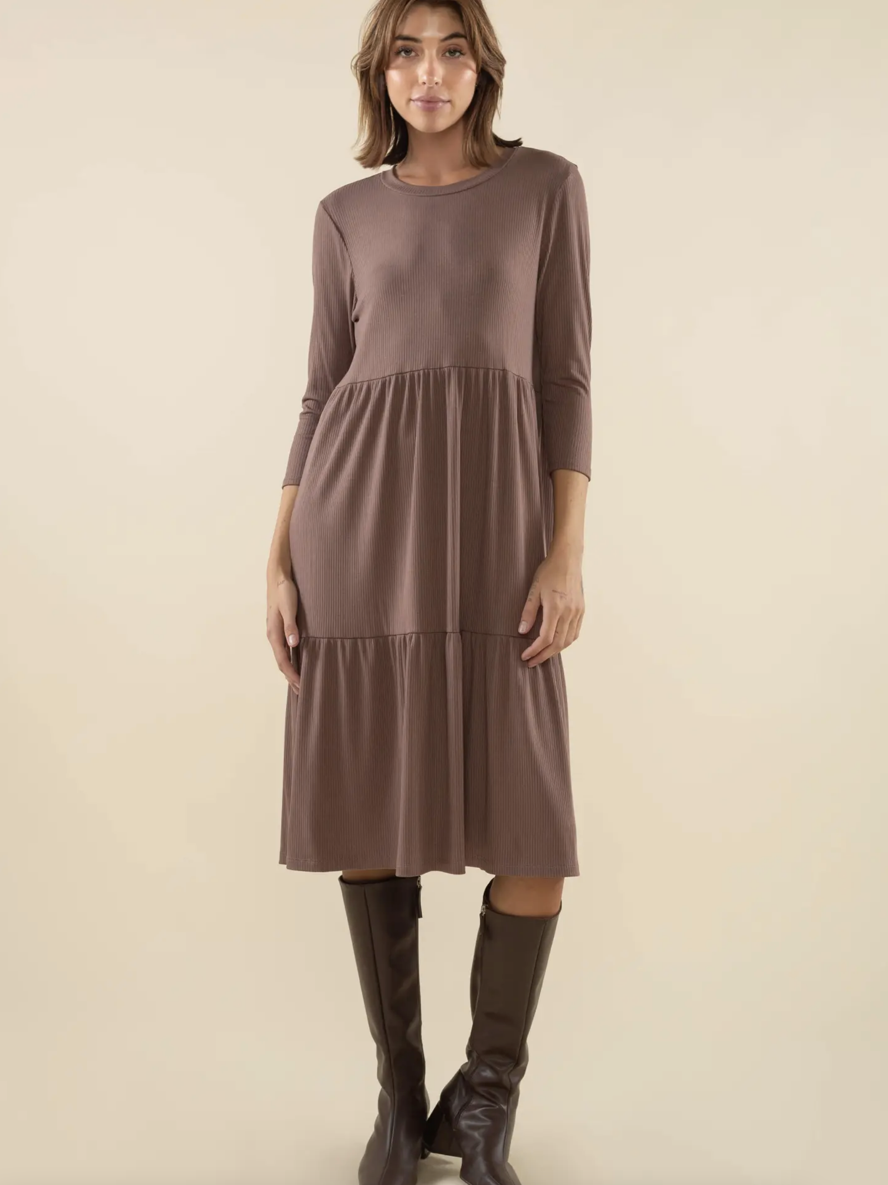 A 3/4 sleeve ribbed & tiered midi dress. It's a versatile basic that's easy and effortless. Fit & flare - made from a soft and stretchy jersey knit.