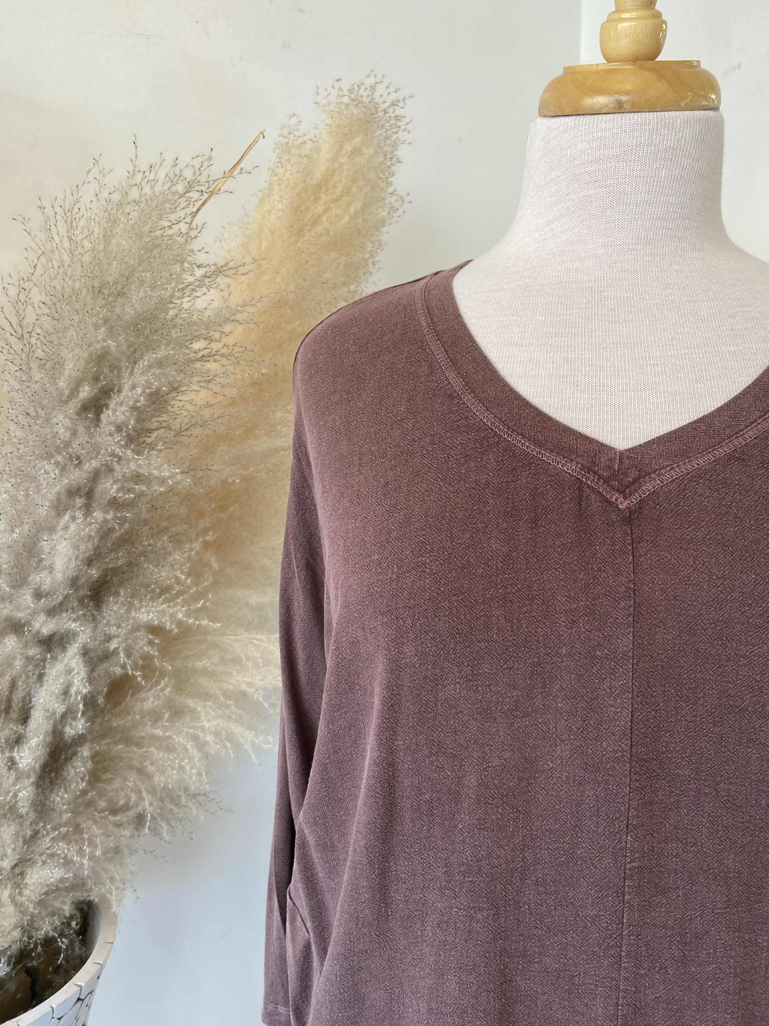 This dolman sleeve v-neck top combines a woven front with a breezy, stretch back for a perfect balance of comfort and style. The shaped side seams add a flattering touch. This design makes it your new go-to for all-day ease and great layering options.