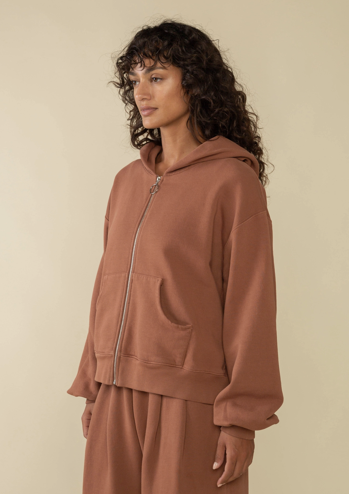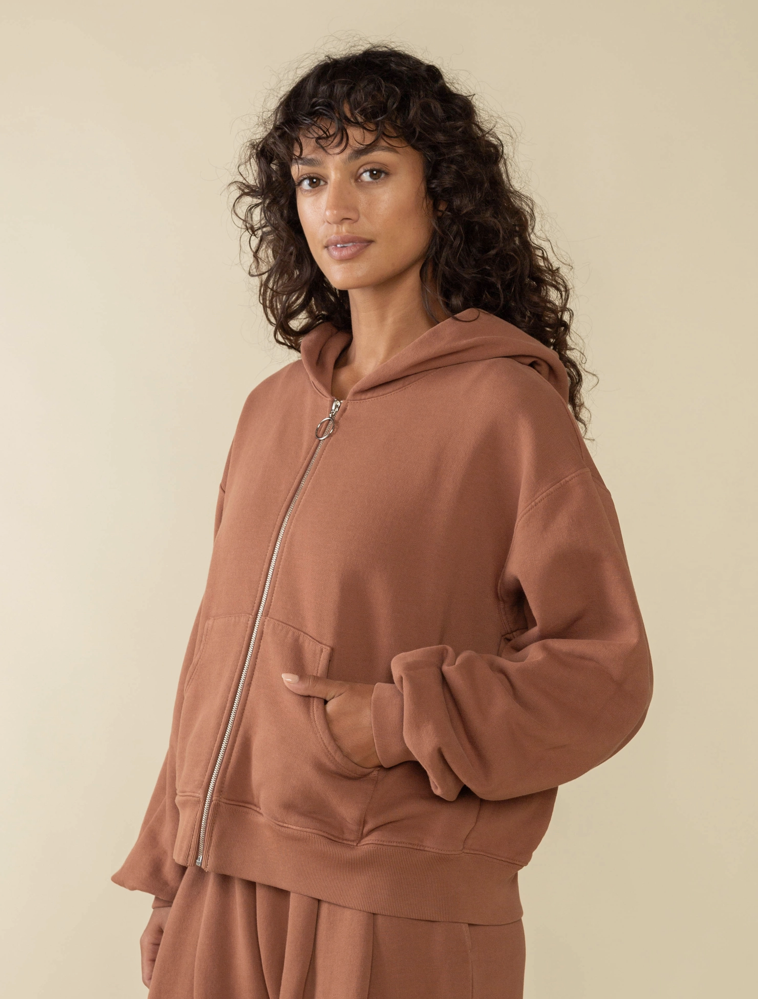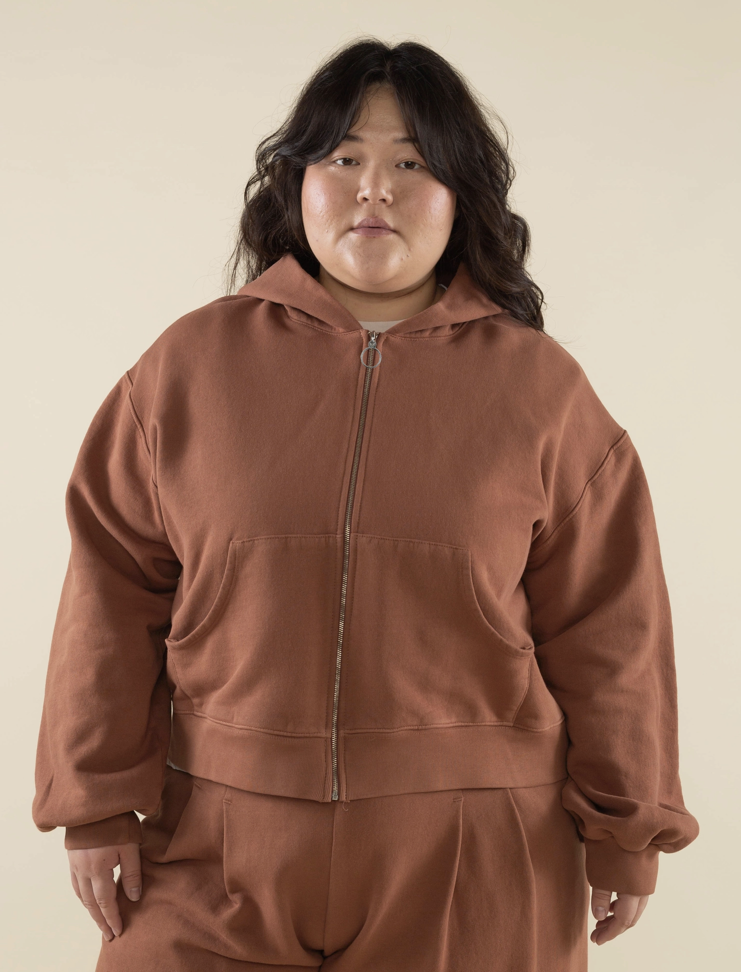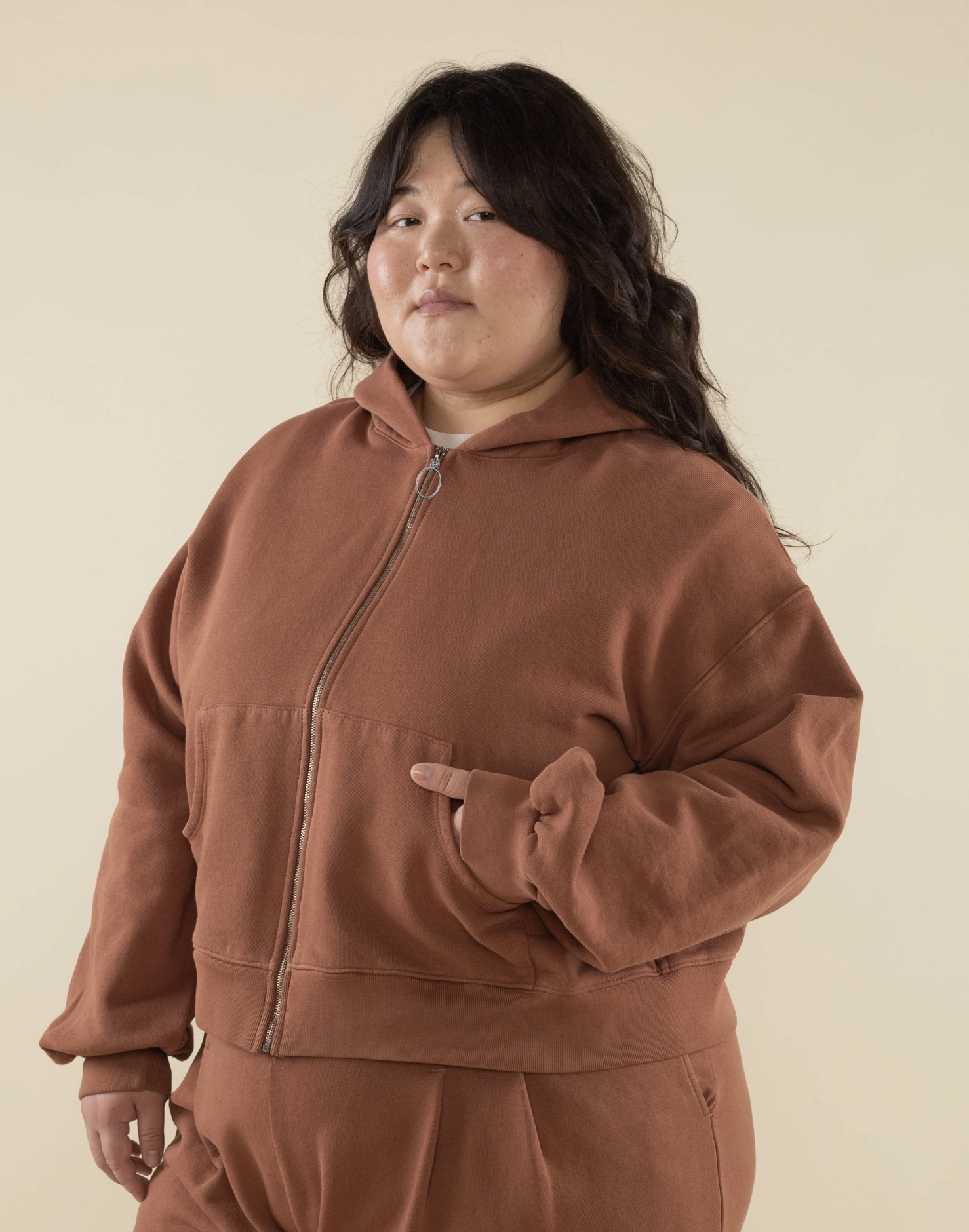 Garment dyed zip front hoodie. • Oversized hood • Center front zipper • Kangaroo pocket • Mid length for slightly cropped fit • Boxy, oversized fit