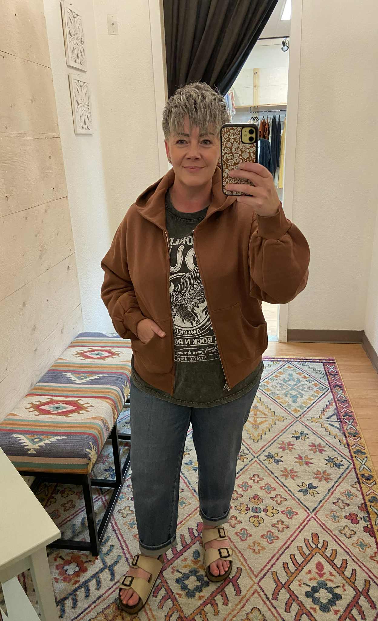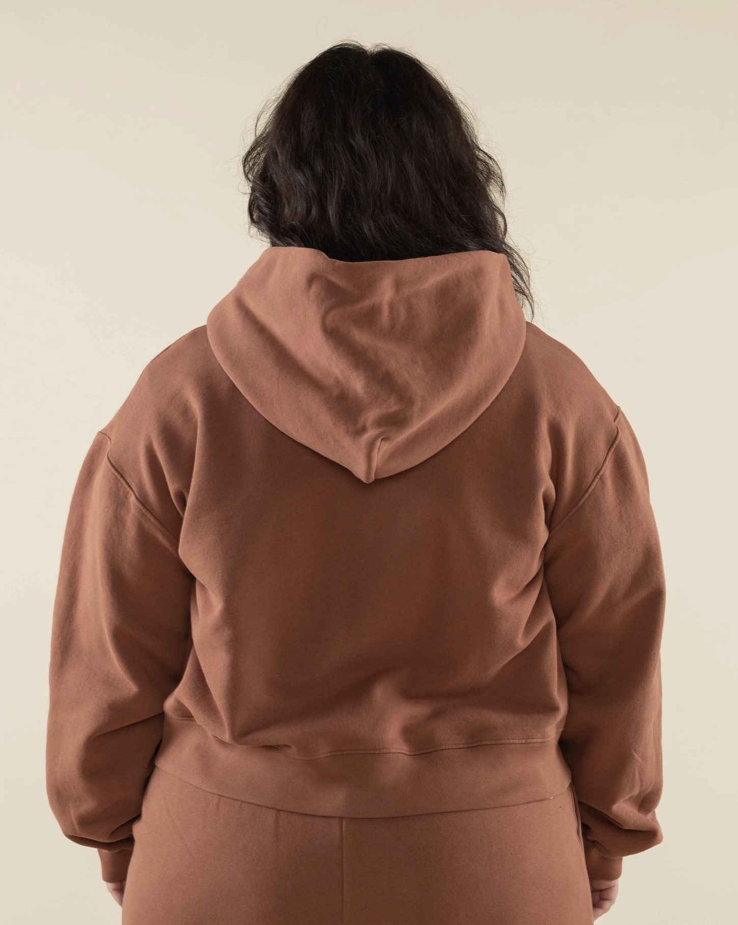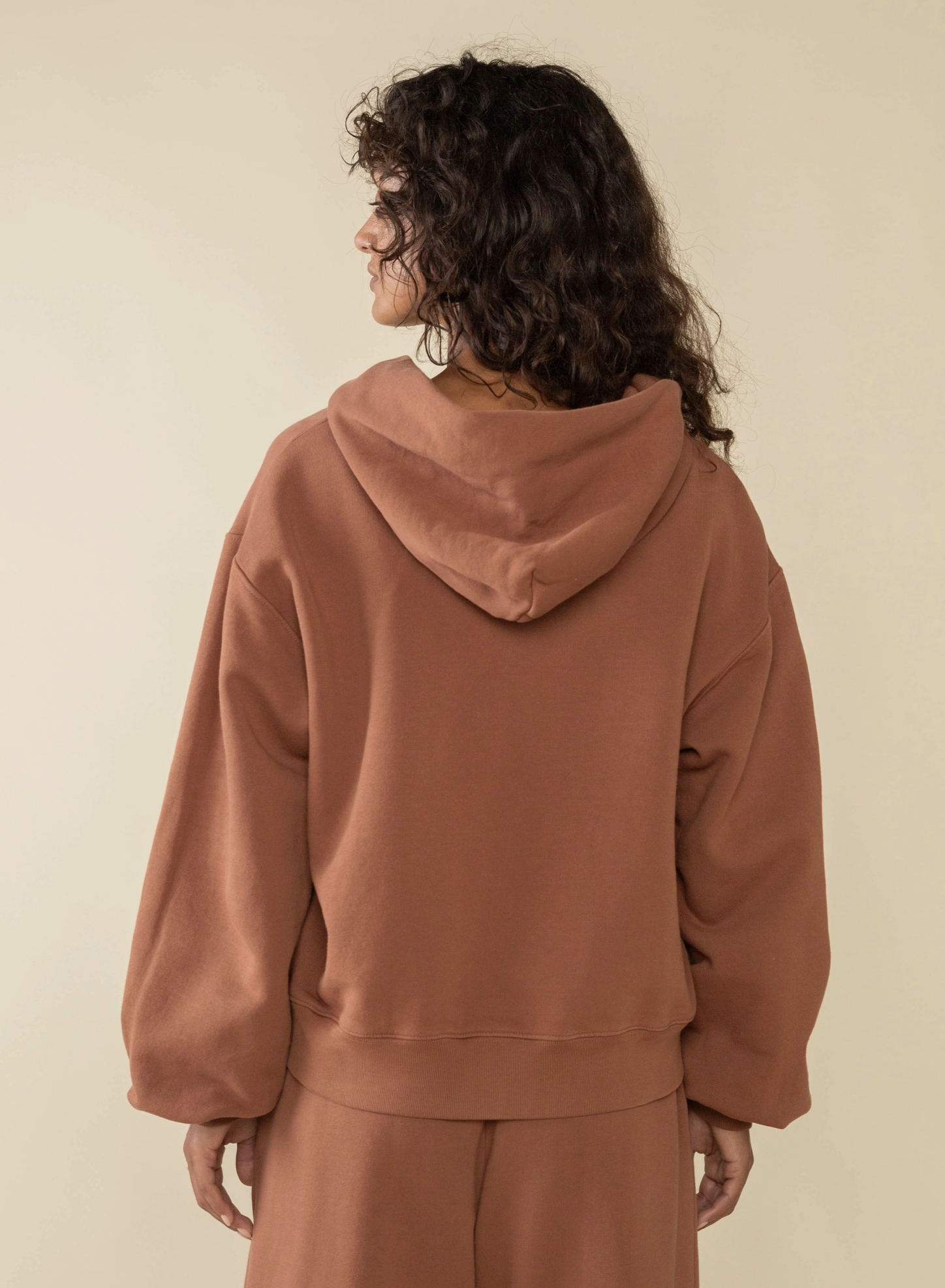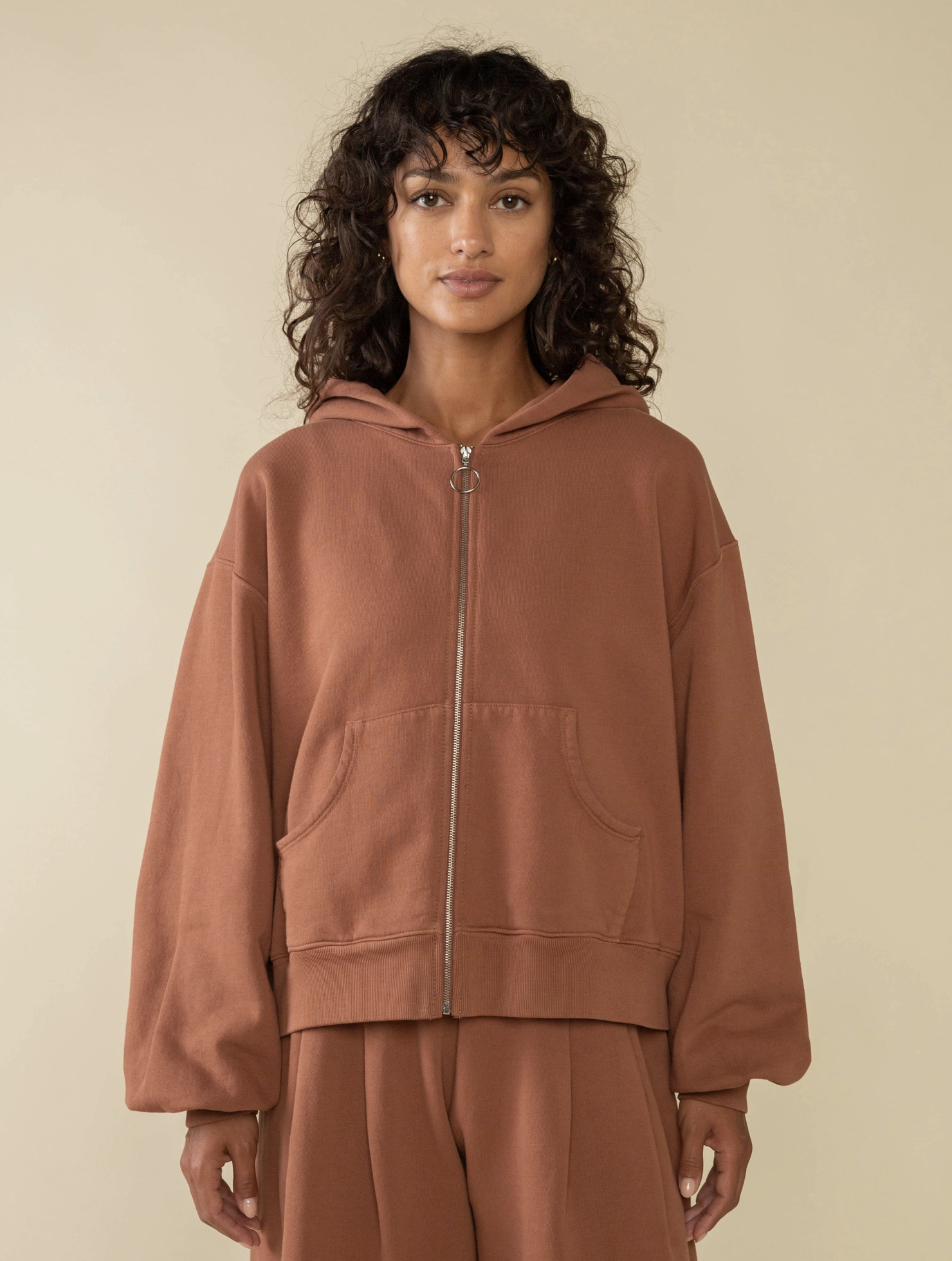Garment dyed zip front hoodie. • Oversized hood • Center front zipper • Kangaroo pocket • Mid length for slightly cropped fit • Boxy, oversized fit