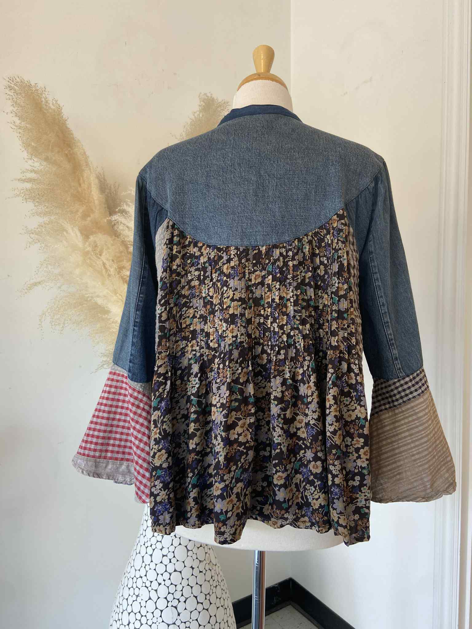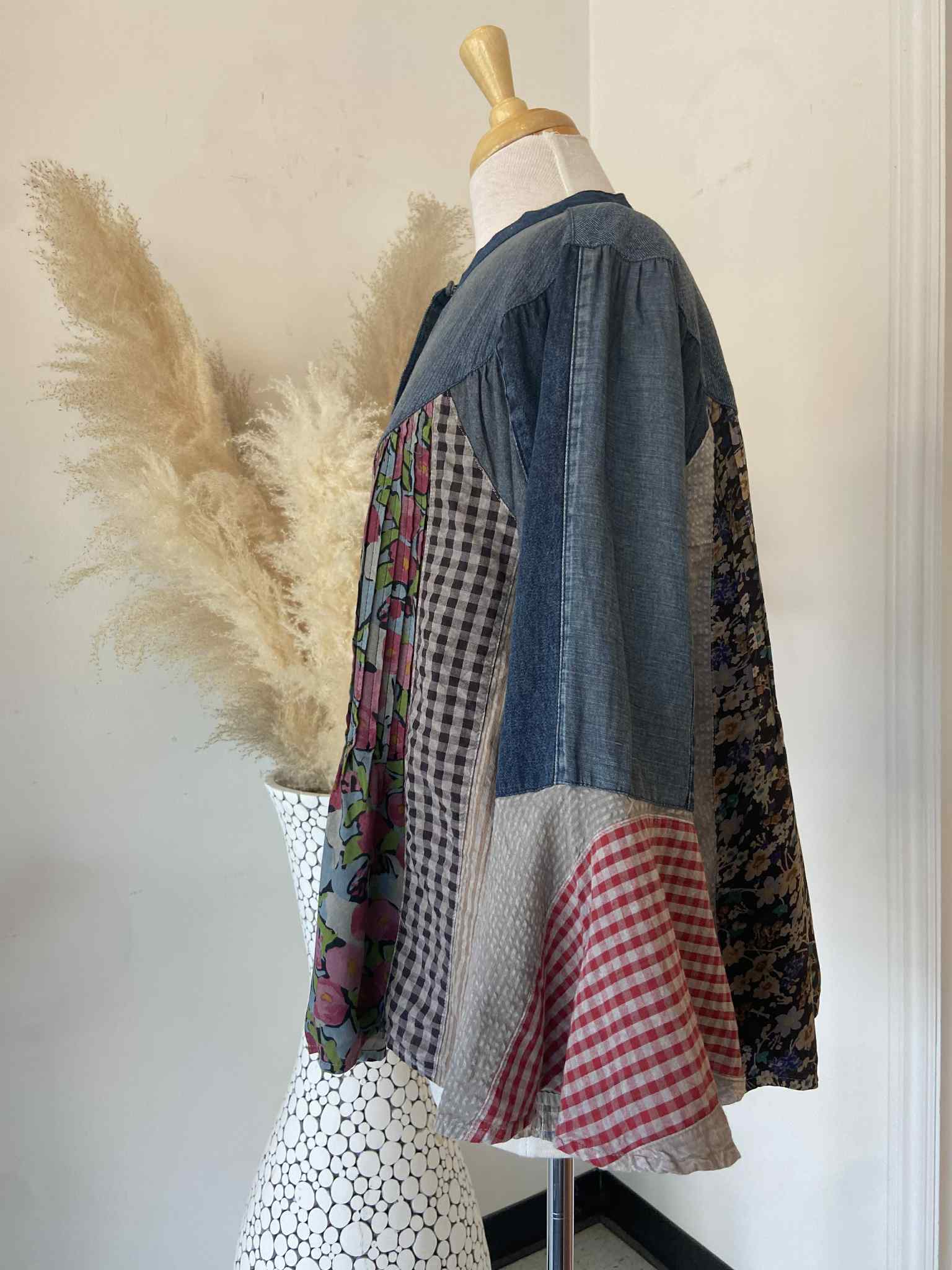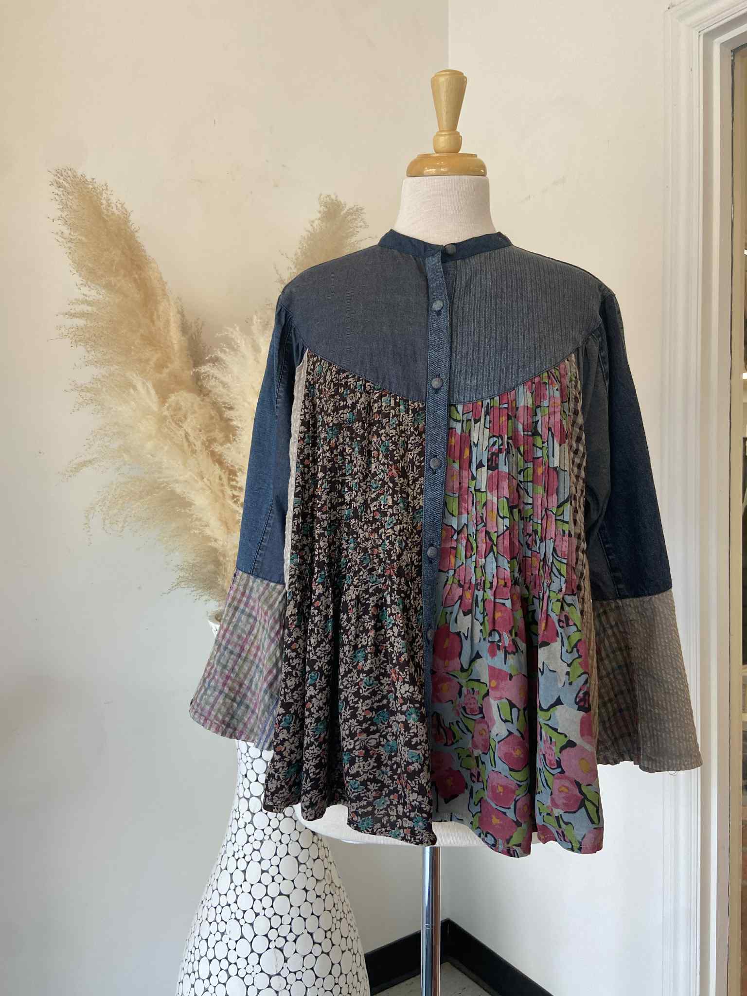 Boho style top with front yoke and flare sleeve. Overdyed patchwork makes each piece one-of-a-kind.