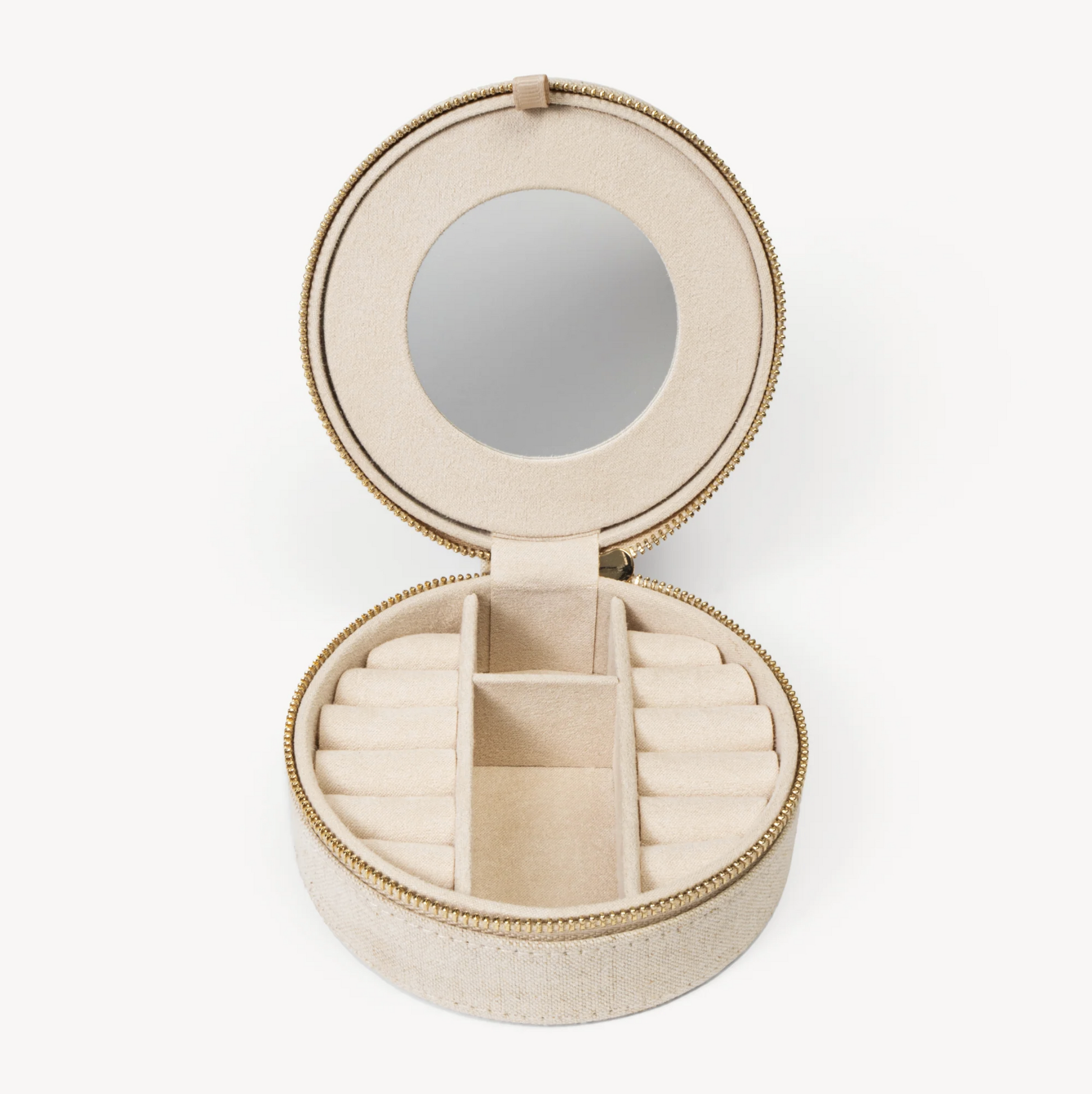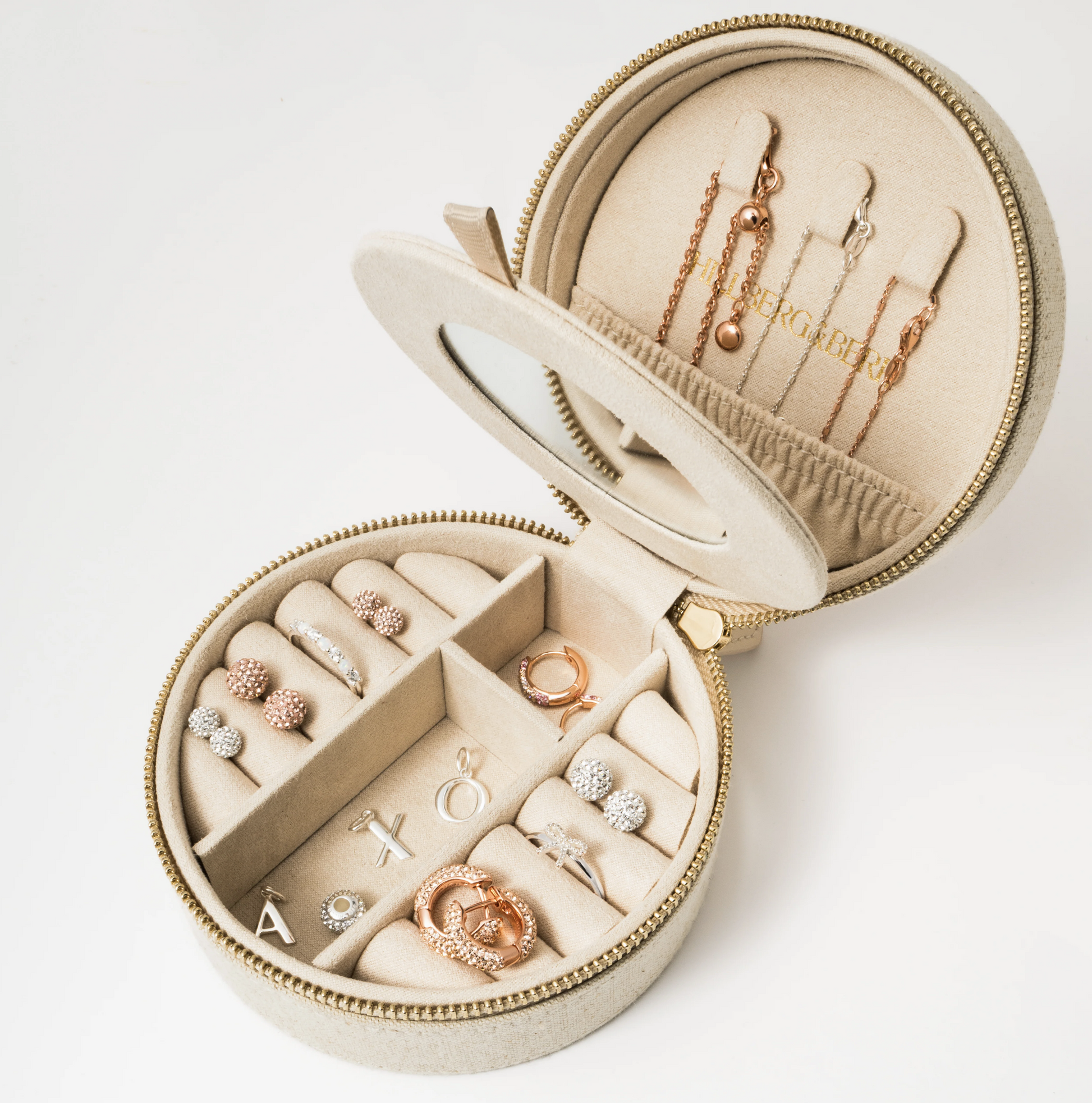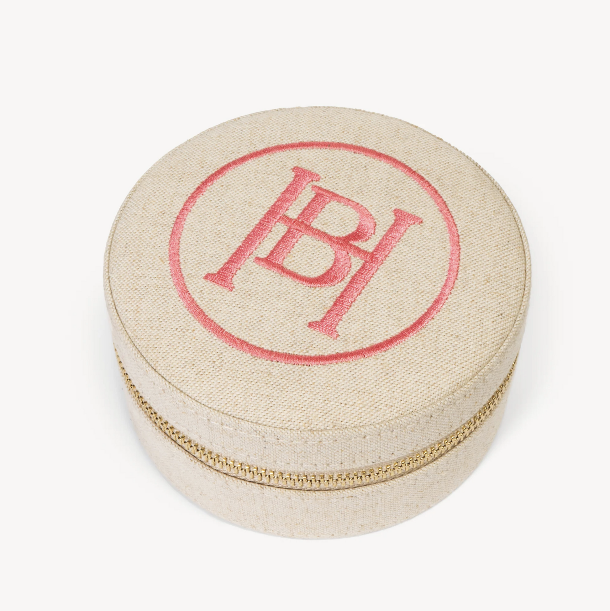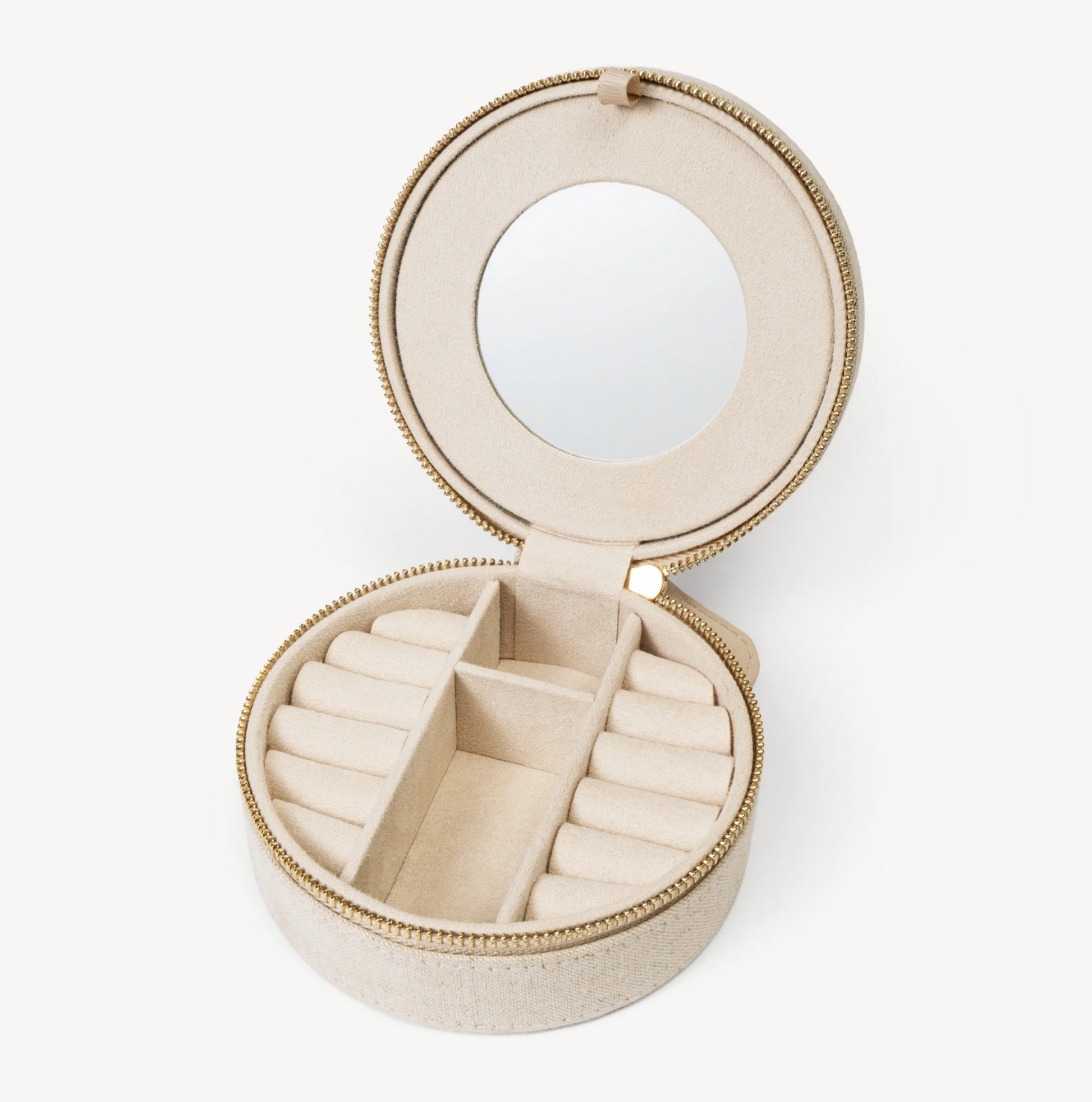 Made for travel, perfect for everyday. This round linen jewellery case blends style and function with a natural linen finish and Hillberg & Berk monogram embroidery. Inside, thoughtful compartments keep your studs, rings, bracelets, and chains safely stored—whether you’re headed out of town or tidying your top drawer. Pretty enough for your dresser, compact enough for your carry-on.