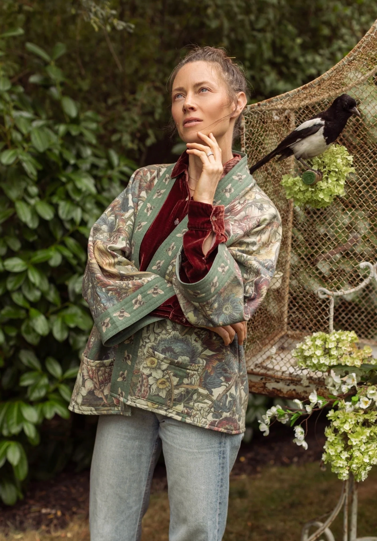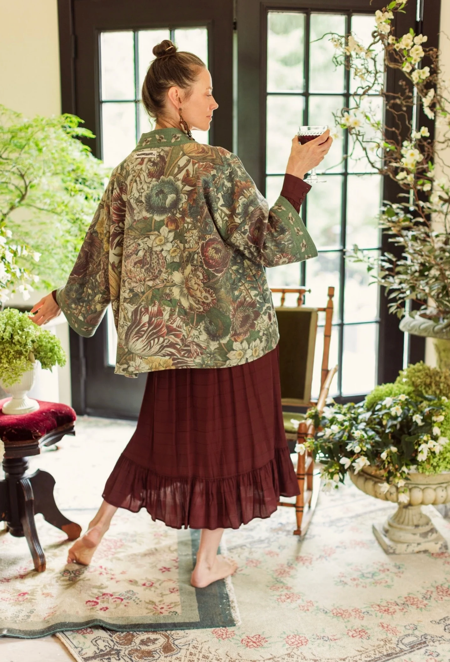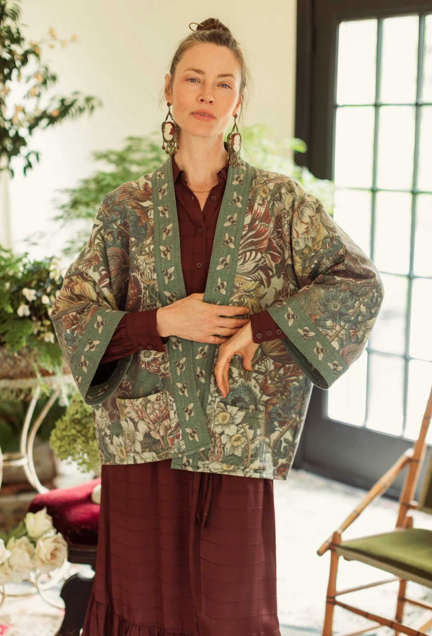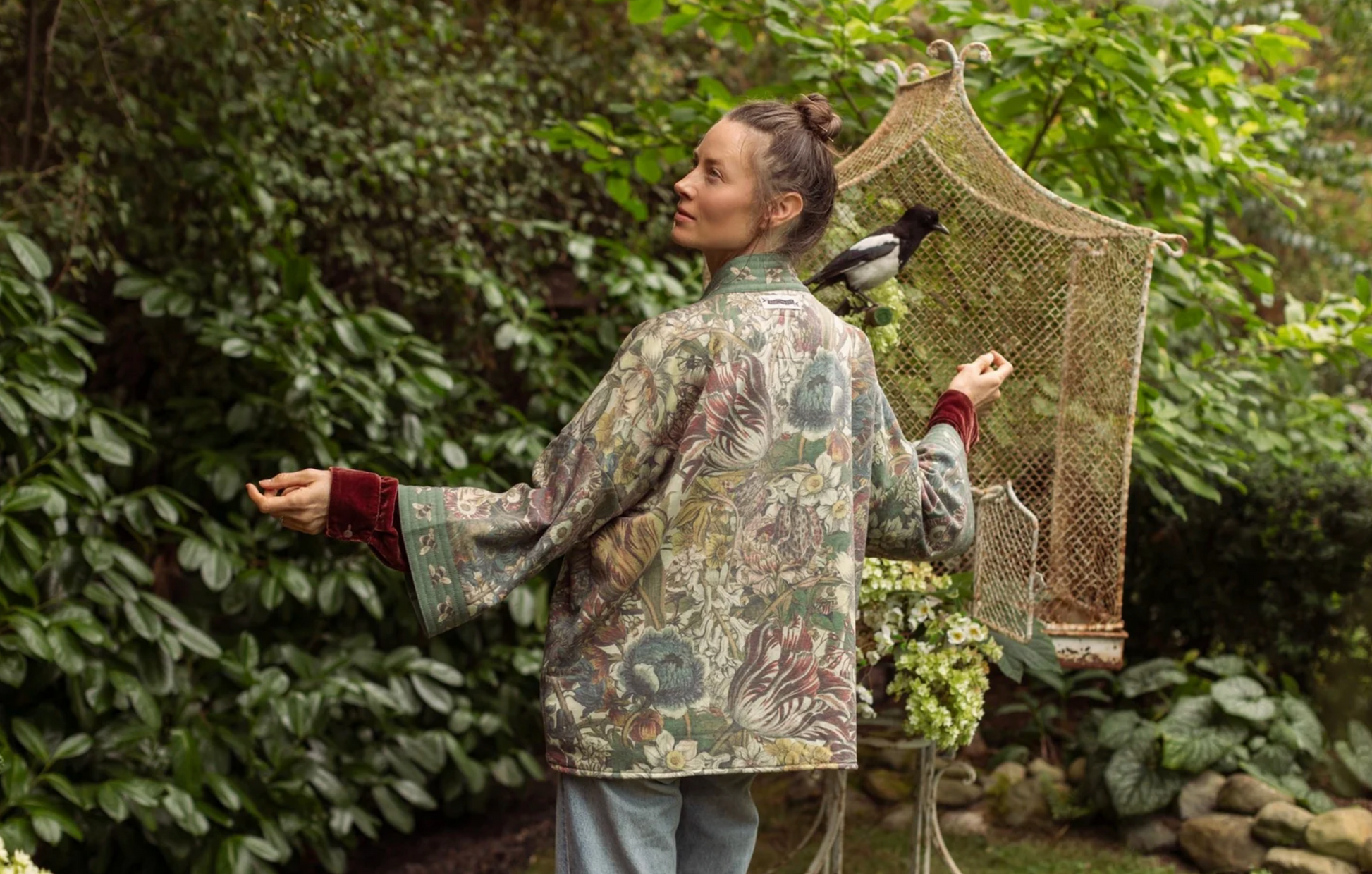 An enchanted garden of earthly delights! Our lush and verdant botanical print comes from the “12 Months of Flowers”, a series of remarkably beautiful hand-coloured etchings from the 1700s by engraver Henry Fletcher. The prints were commissioned by famed English gardener Robert Furber, and were published as a catalogue of flowers and seeds according to season. We chose the Fletcher’s print from the month of March for its delightfully detailed blooms, and then layered the flowers together to create a wild and wonderful print that captures the exuberance of the garden. The charming bumblebee trim comes from a museum seed catalogue from the late 1800’s. We are so excited to wear this print! It’s such a joyful and abundant design that goes with almost every colour. Sometimes more is more — more flowers, more love, more everything :)