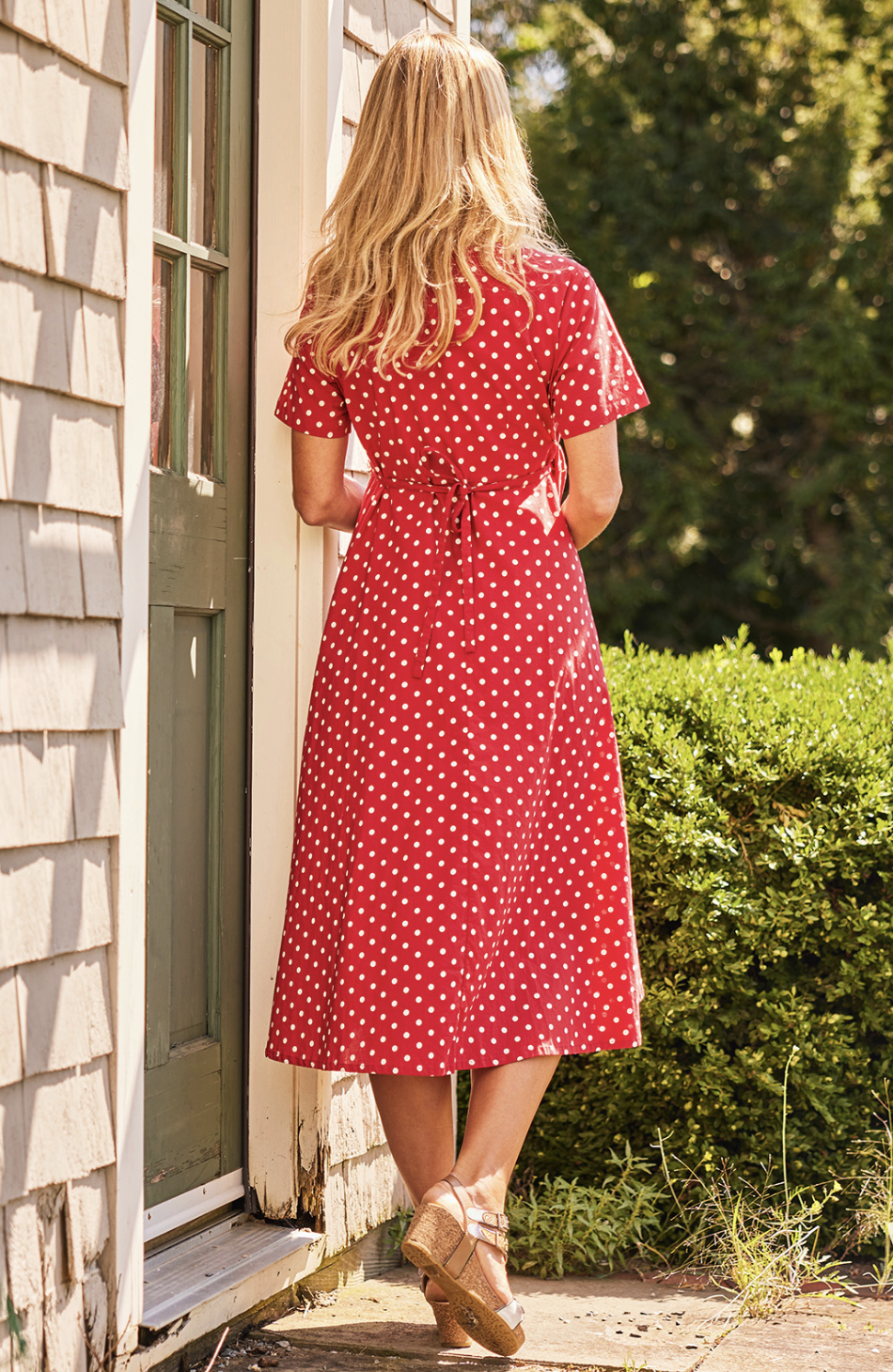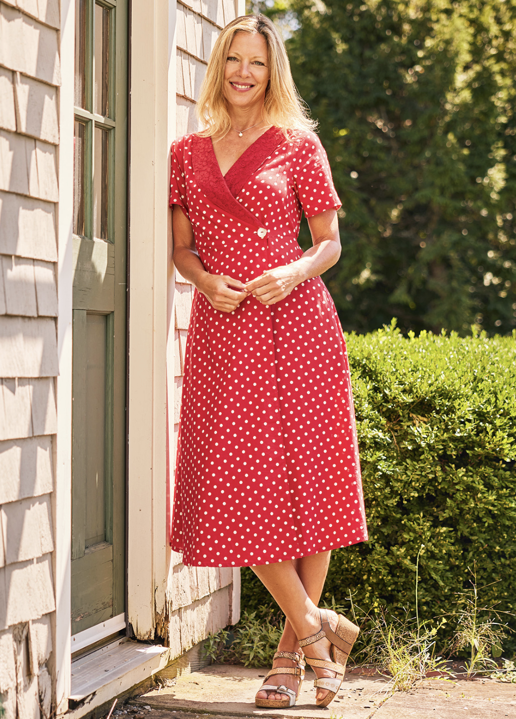 - A true wrap dress secured with inner ties and a large mother of pearl button at waist