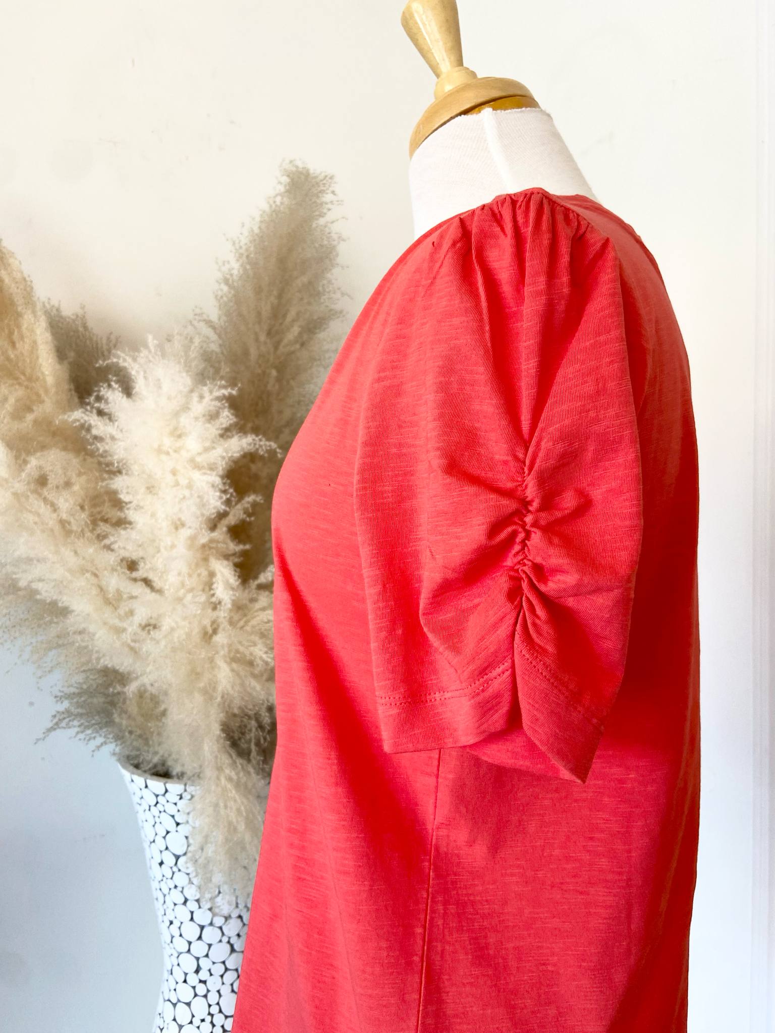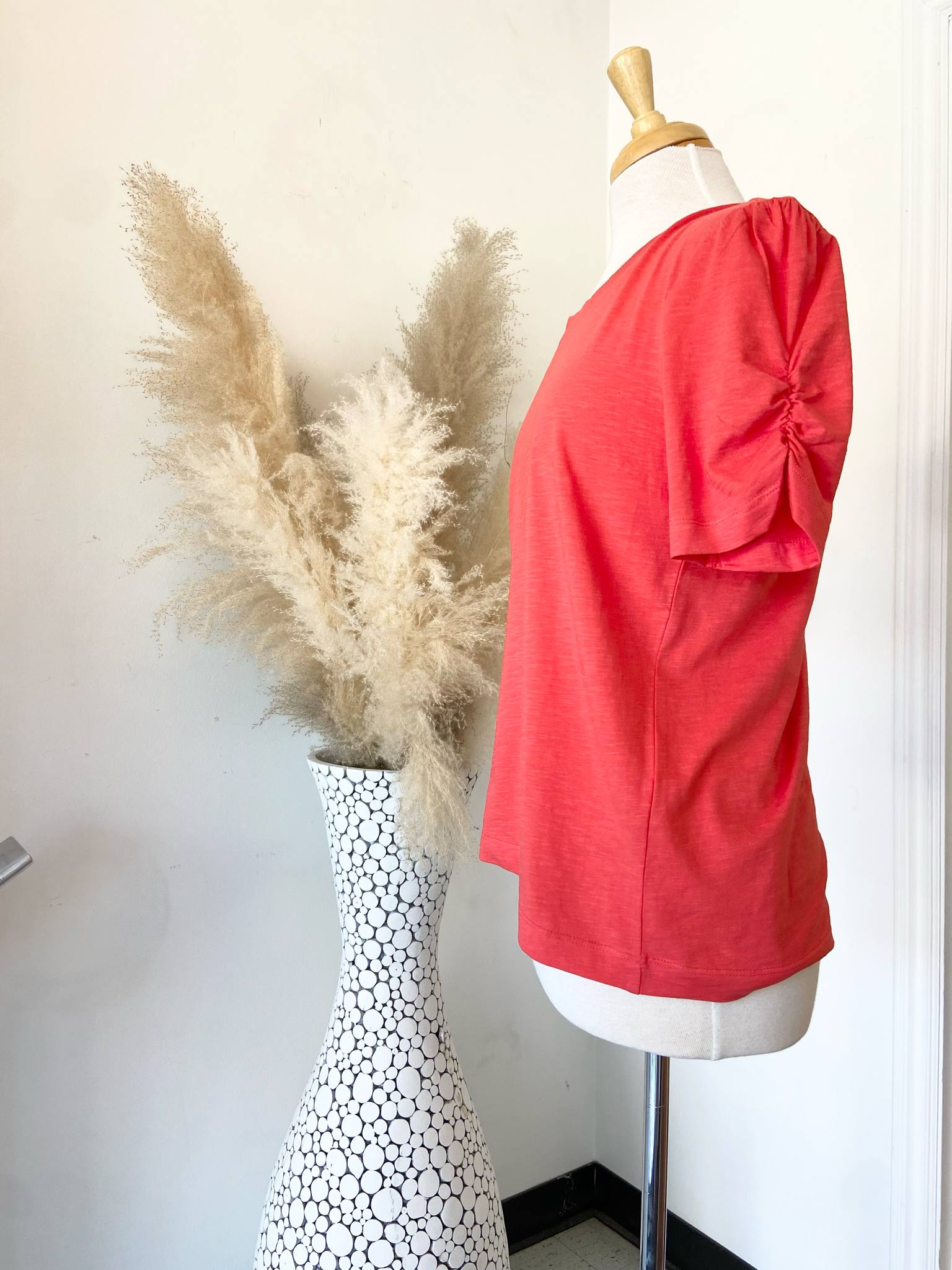 Small scoop neck with short sleeves that have rouche gather detail and slight puff sleeve. Fits true to size.