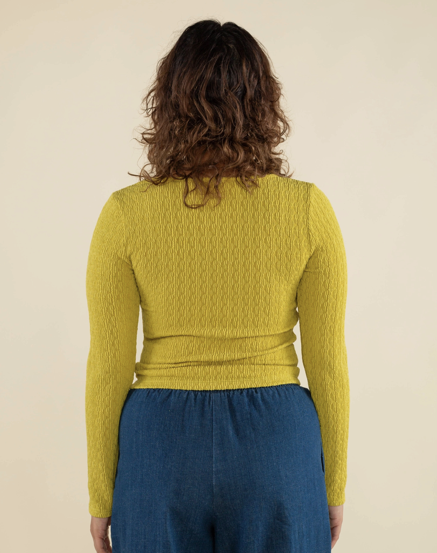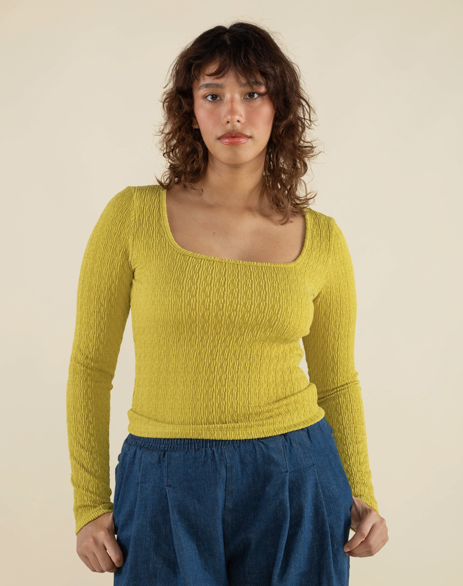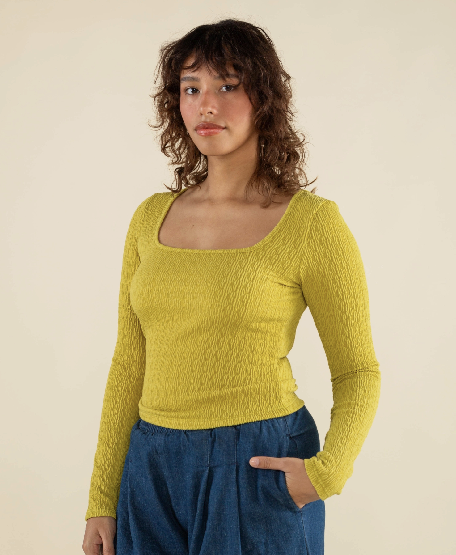 • Deep square neck • Long sleeves • Bodycon fit • Mid length for slightly cropped fit • Fabric is a textured jacquard knit