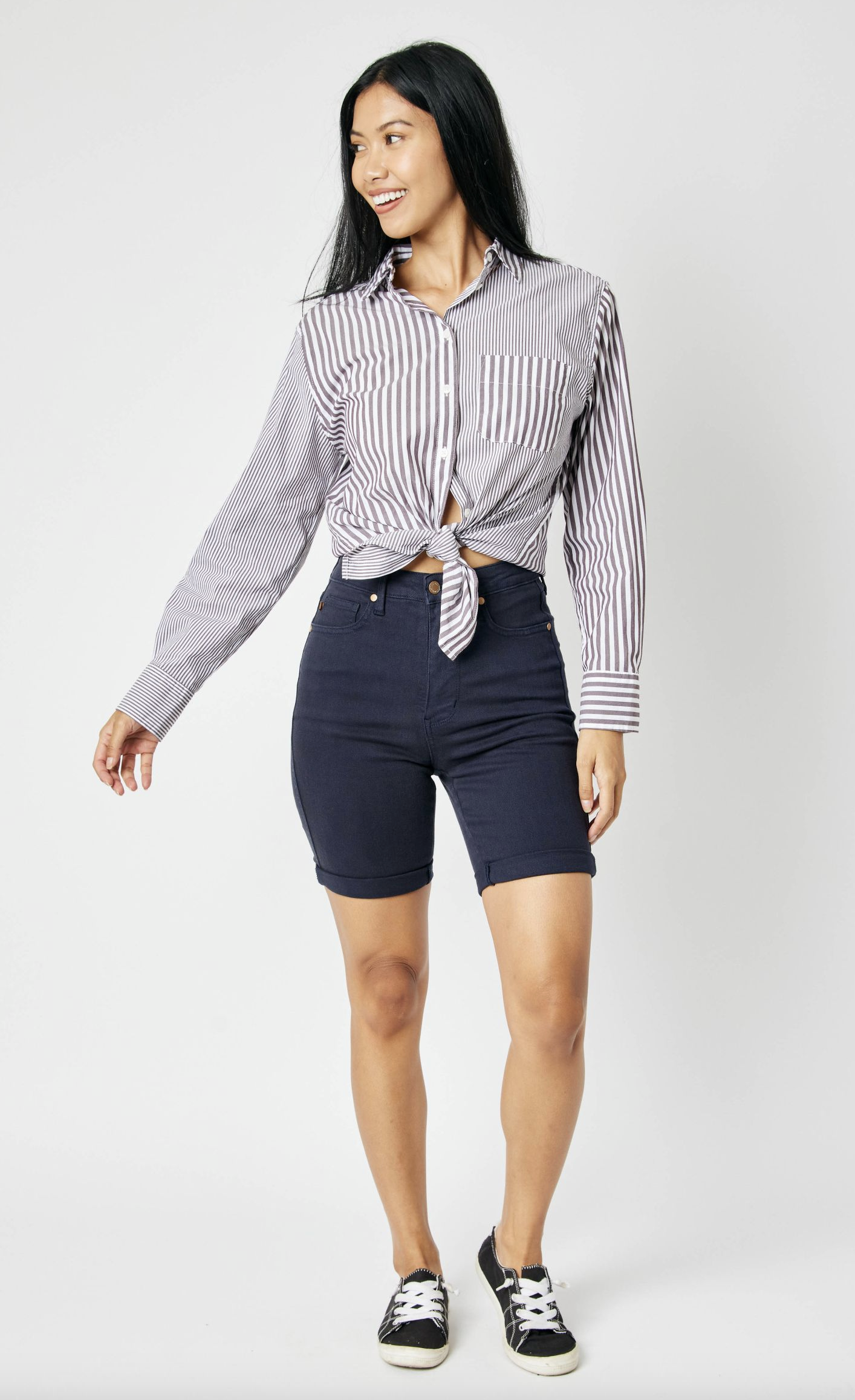 - HIGH WAIST NAVY GARMENT DYED TUMMY CONTROL BERMUDA SHORTS