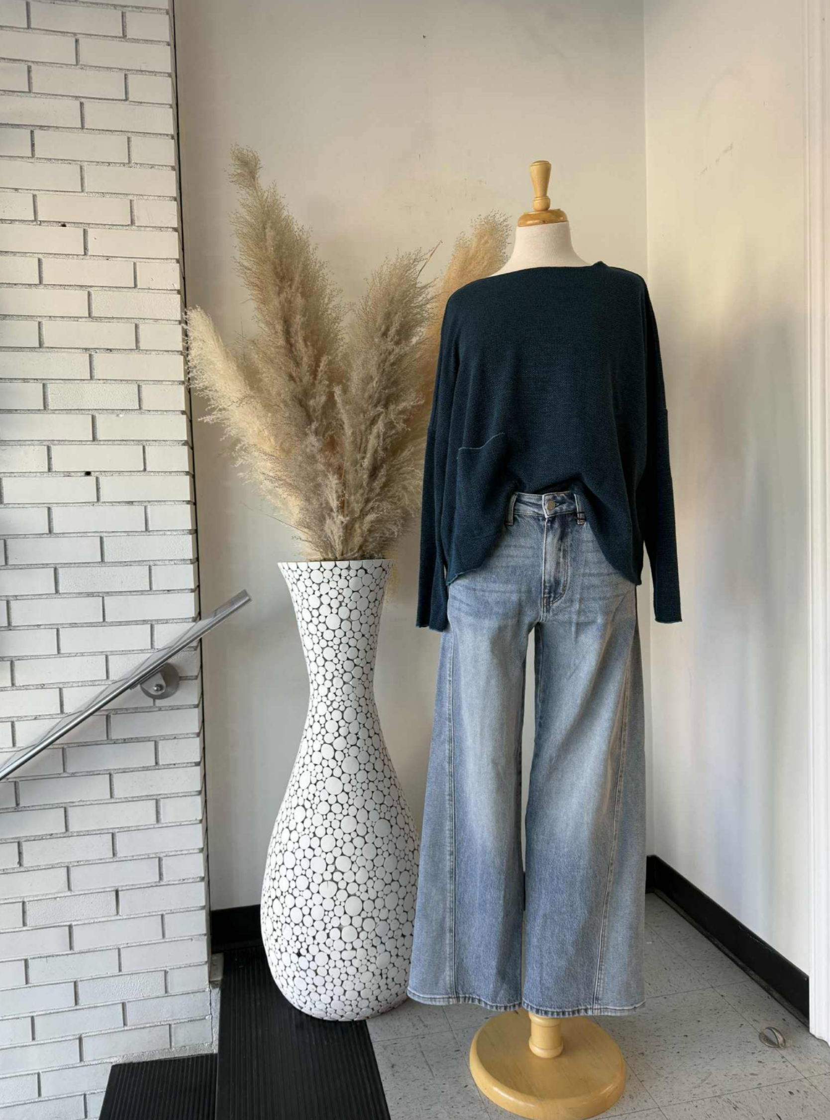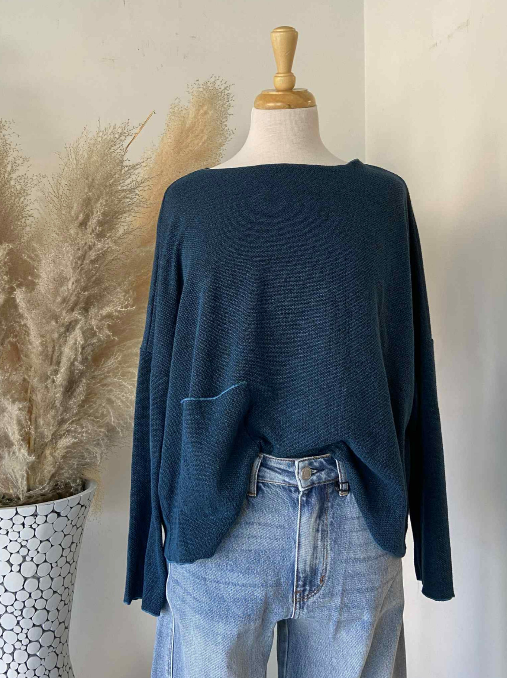 Beautiful one size top with drop shoulders and one front pocket. Loose and flowy style.