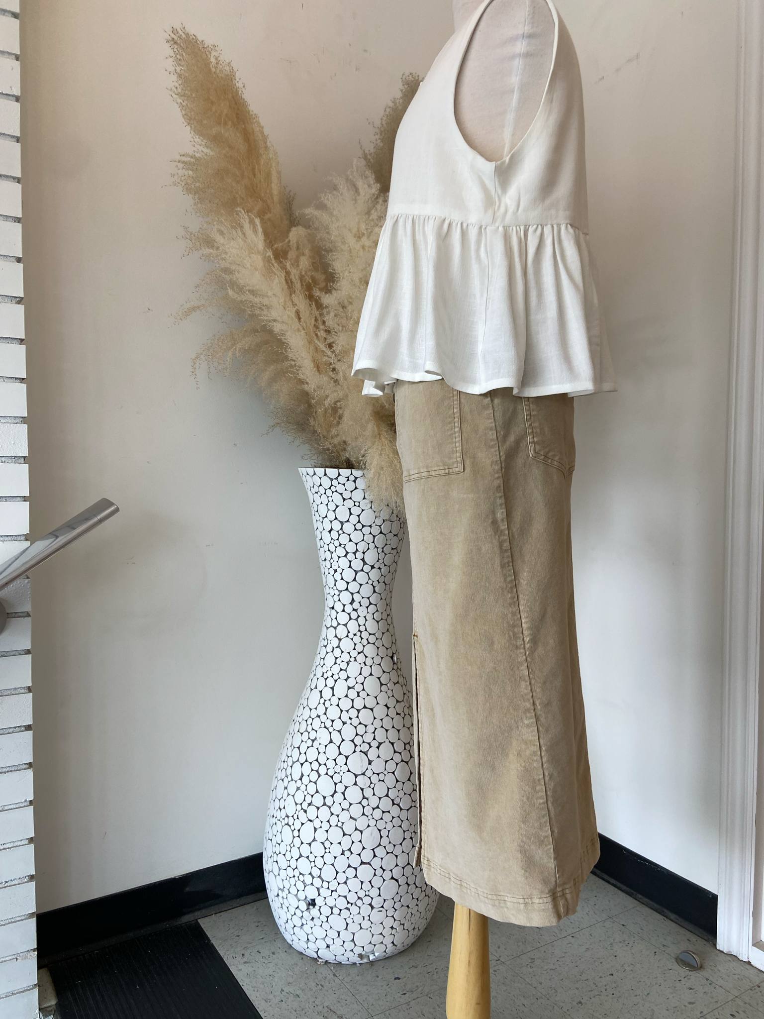 A casual corduroy-denim skirt that that falls past the knee with deep front and back pockets. This soft midi skirt has multiple button closures, belt loops, and a thirteen inch front slit.