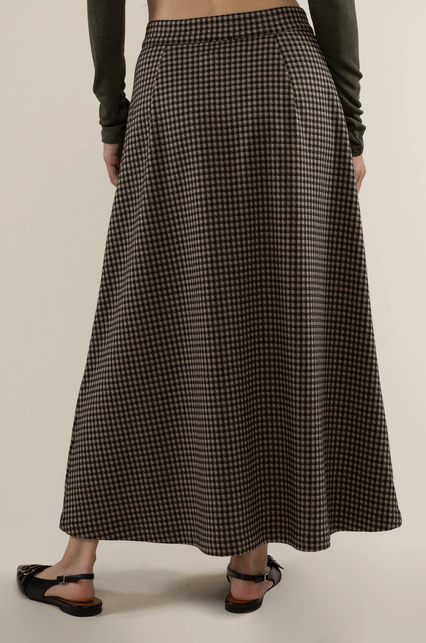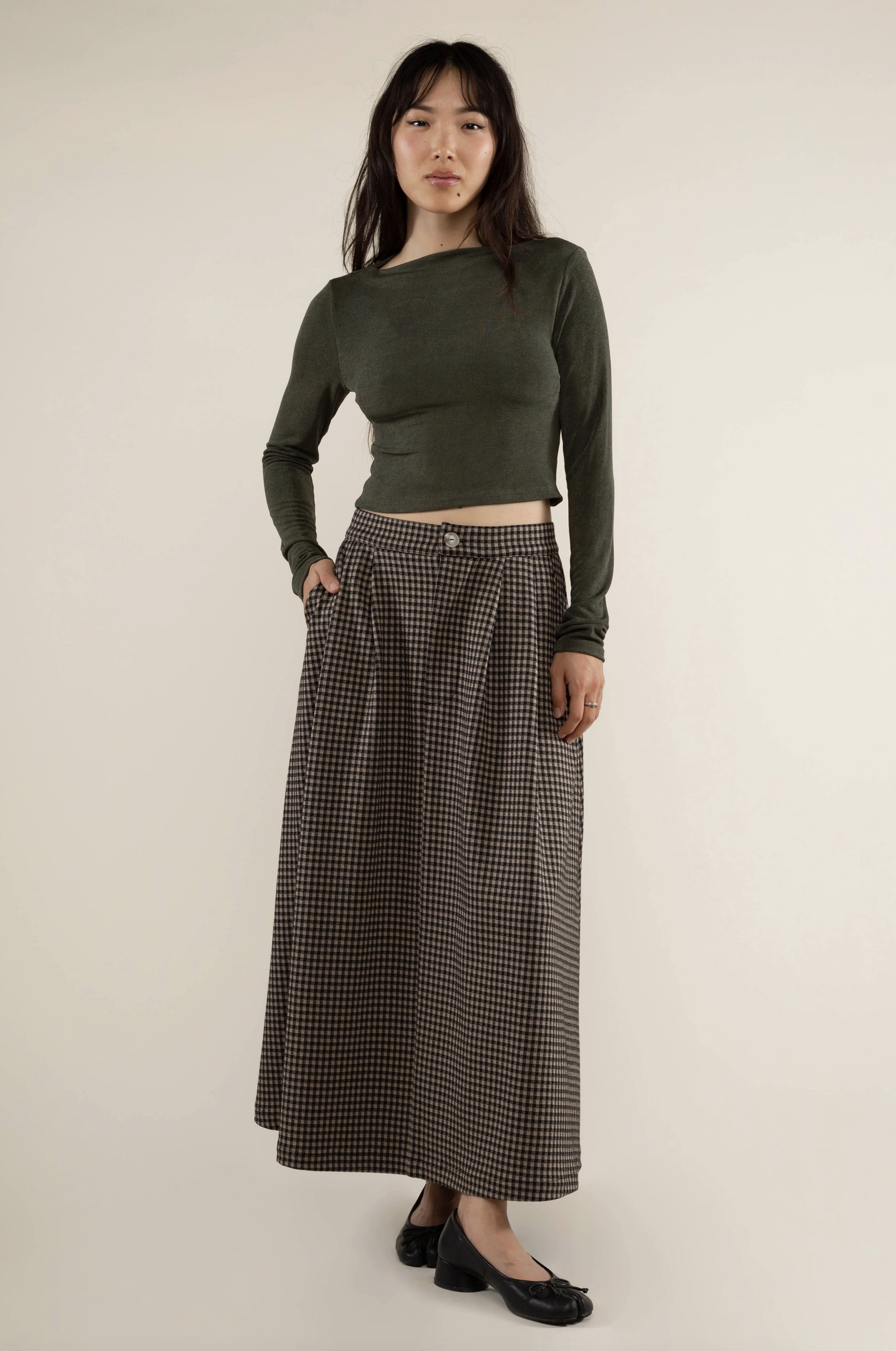 Maxi skirt with zipper and button closure at front. The skirt is a a-line shape with pleats at the front and side pockets.
