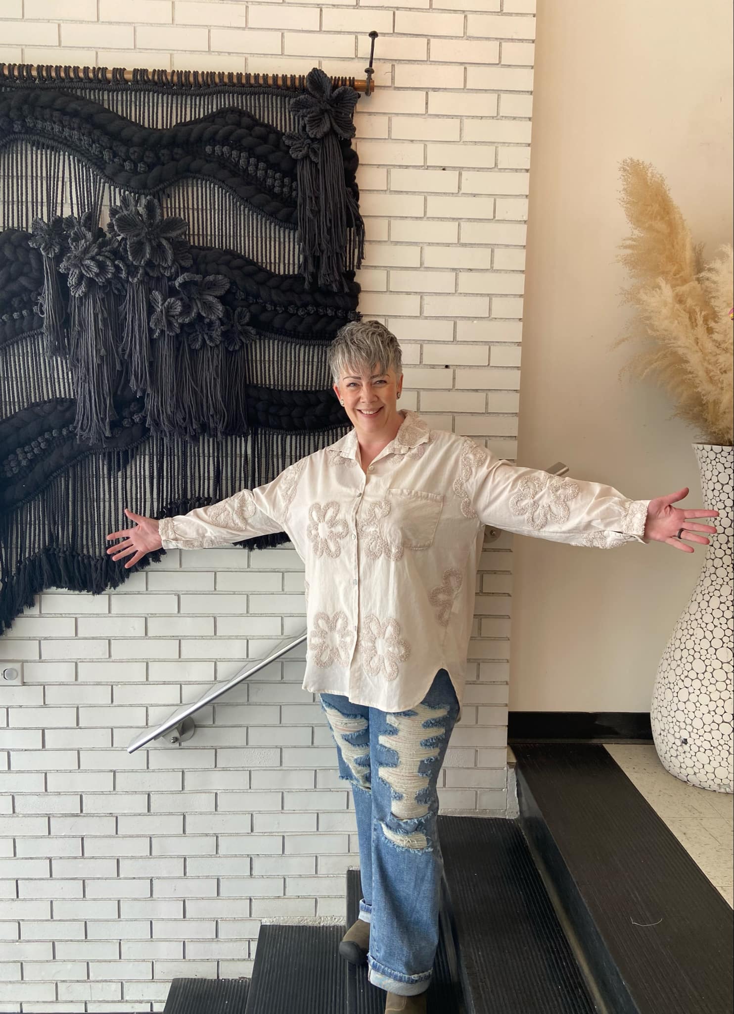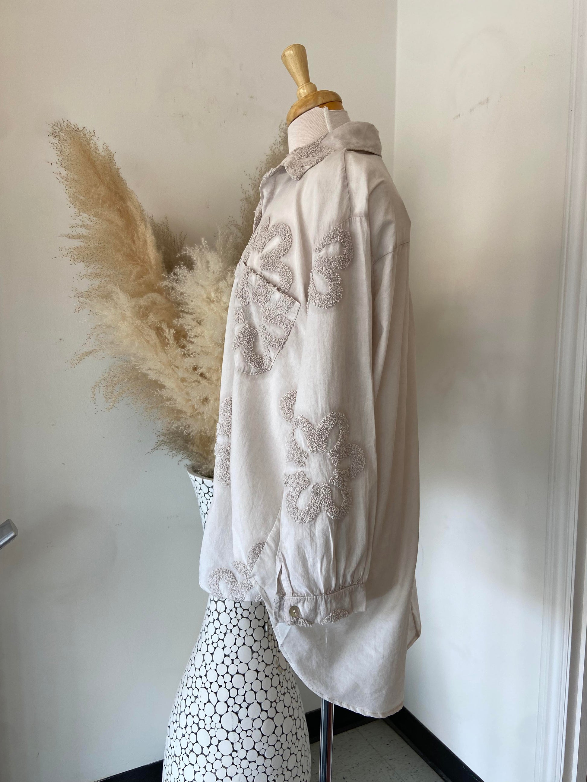 Not just any long sleeve, this one has some pizazz! This light weight and over sized button up has tufted flowers!!