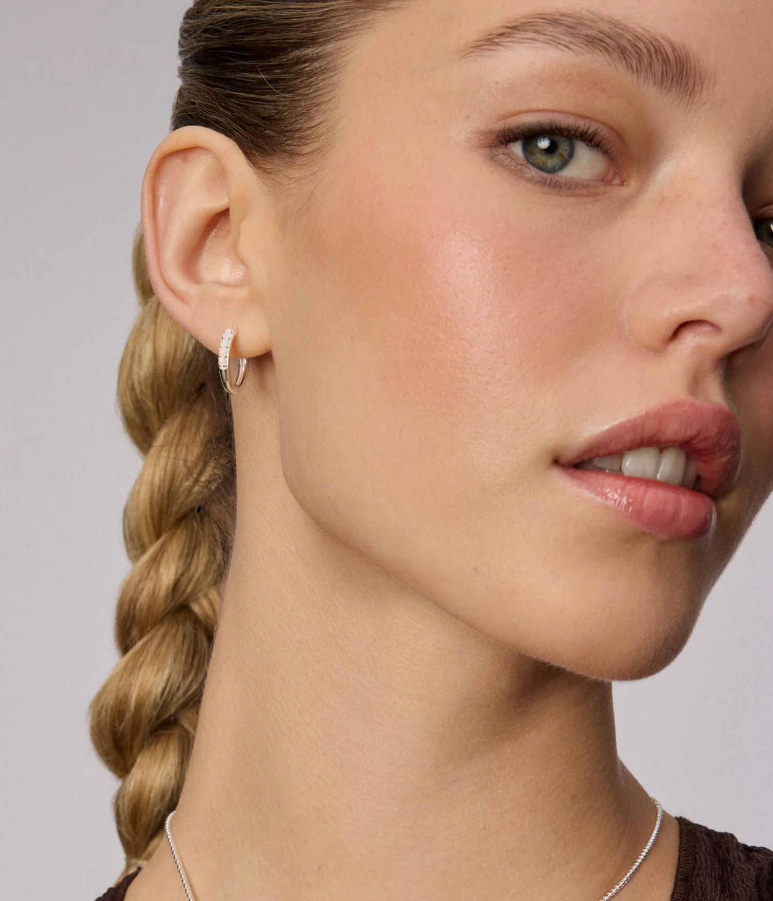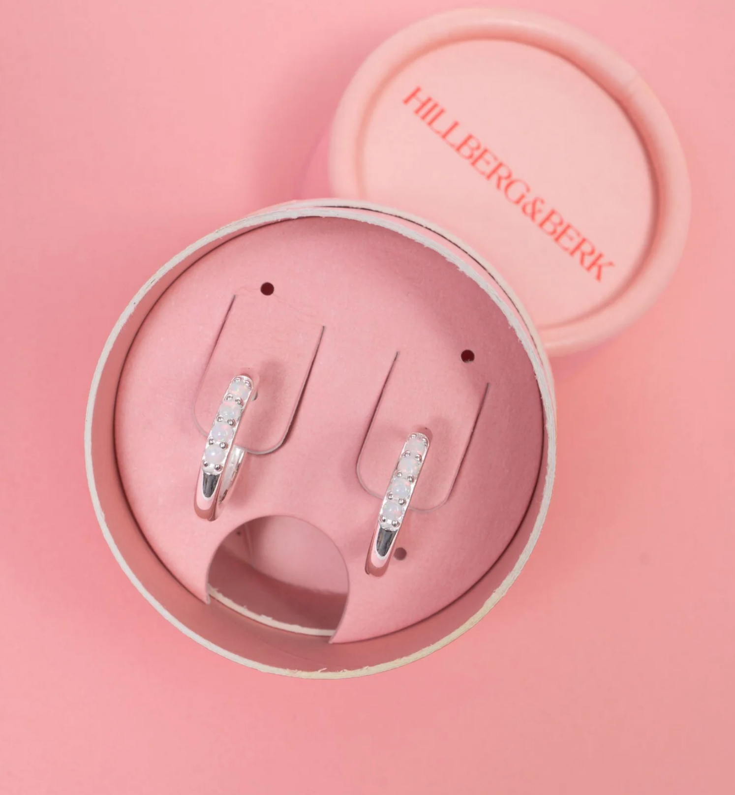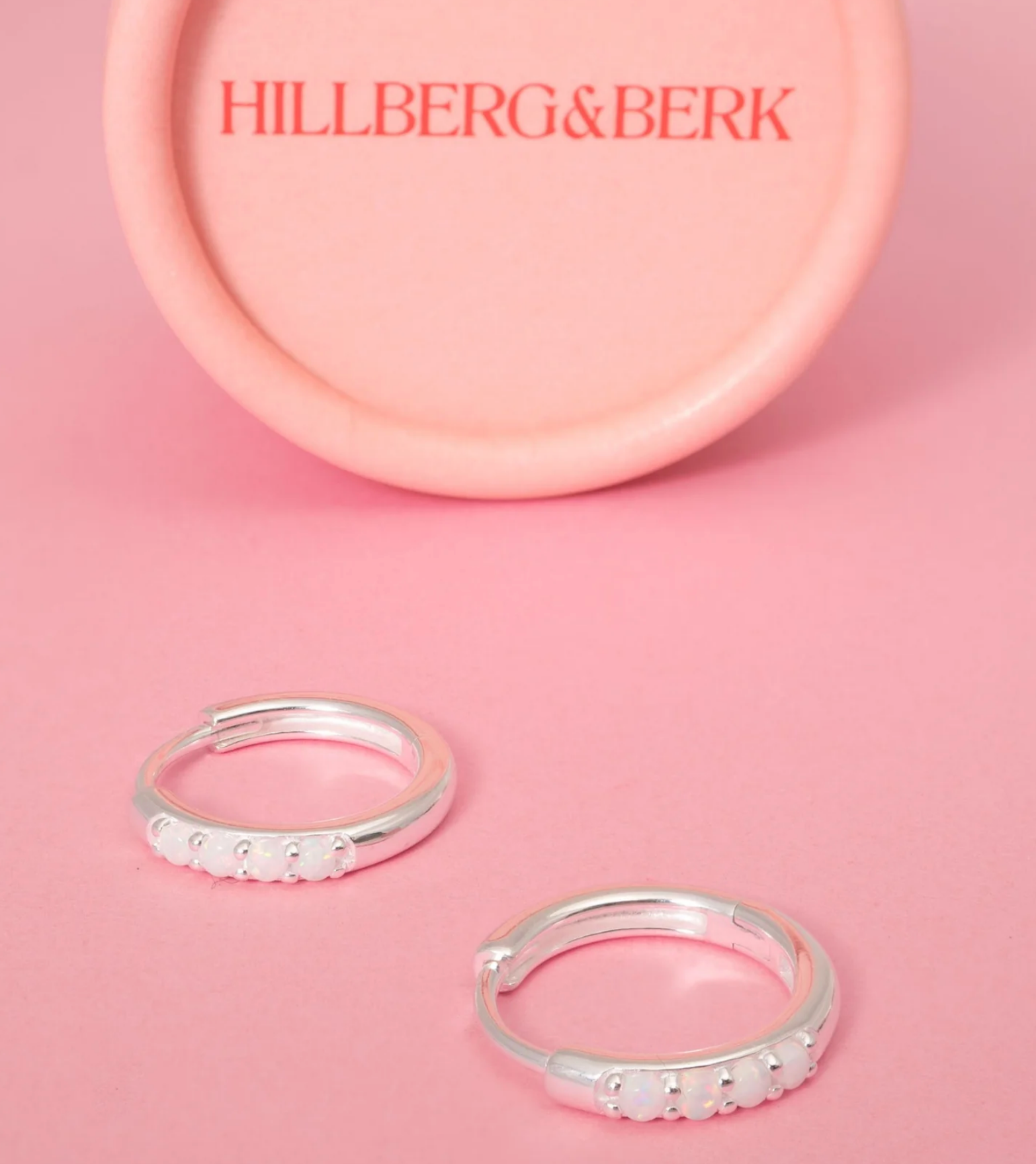 Crafted in sleek sterling silver, the Small Opal Hoop Earrings feature four luminous lab created opals that glow with soft iridescence. Lightweight and versatile, these 12mm hoops add a refined, effortless touch whether worn alone or stacked.