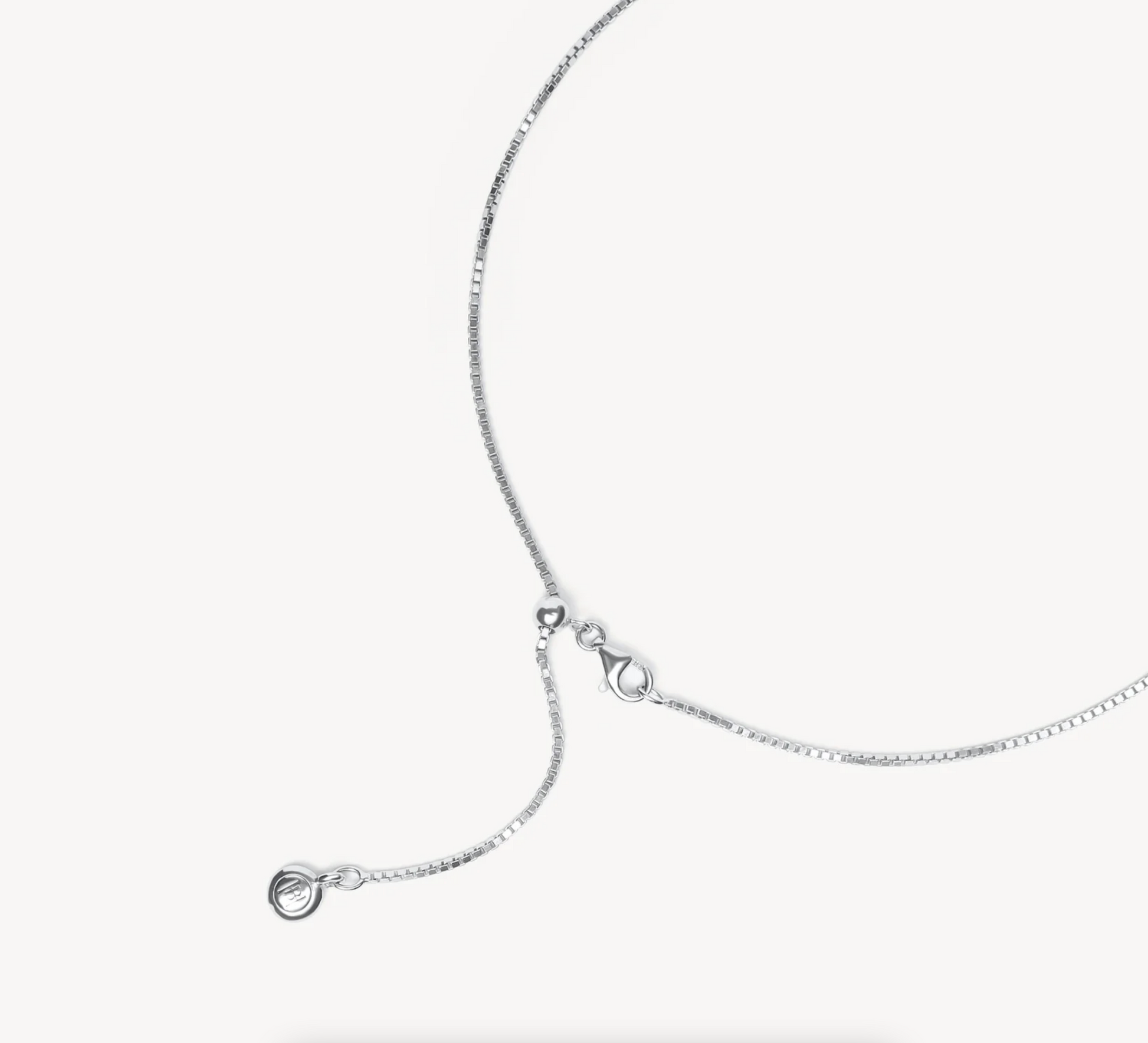 The Box Chain Slider Necklace is a timeless piece designed to be the backbone of any collection. Crafted from sterling silver, this chain showcases box-cut links that catch the light with every move.