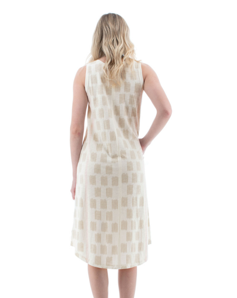 The Talia Dress is simple, yet stunning bringing you a wardrobe staple you will want to wear day after day. A center stripe draws the eye vertically, elongating the wearer and a paintbrush inspired print dots the body of the dress. Thanks to the eco-conscious blend of organic cotton and Tencel™ lyocell, the Talia is drapey, comfortable, flattering, and resists wrinkles and clinging. These fibers also dramatically reduce the negative impact of conventional materials, saving water, resources, and ecosystems. A shirttail hemline curves the bottom of this tank dress, which rests at a midi-length. Throw on with your favorite sneakers for a casual look, or dress up with stunning accessories. Best part? POCKETS!