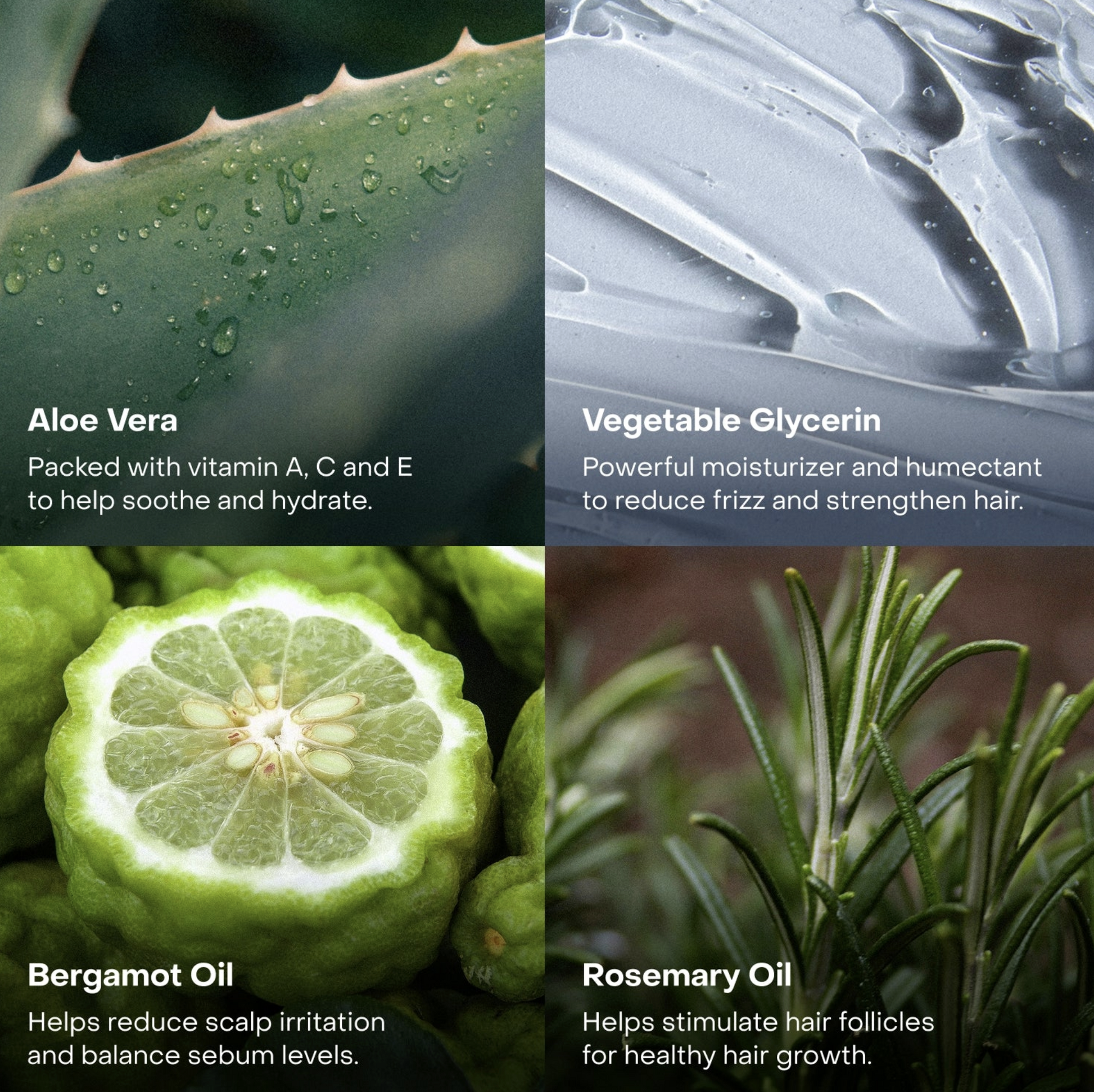 Deep Conditioner: Organic Aloe Barbadensis (Aloe Vera) Leaf Juice, Glycerin, Cetearyl Alcohol, Caprylic/Capric Triglyceride, Cetyl Alcohol, Citrus Aurantium Dulcis (Orange) Peel Oil, Limonene, Behentrimonium Chloride, Hydroxypropyl Starch Phosphate, Brassicyl Isoleucinate Esylate, Adansonia Digitata (Baobab) Seed Oil, Alanine, Arginine, Aspartic Acid, Citric Acid, Brassica Alcohol, Butyrospermum Parkii (Shea) Butter, Cocos Nucifera (Coconut) Liquid Endosperm, Cocos Nucifera (Coconut) Fruit Juice, Cocos Nucifera (Coconut) Oil, Cucurbita Pepo (Pumpkin) Seed Oil, Glycine, Guar Hydroxypropyltrimonium Chloride, Caprylhydroxamic Acid, Histidine, Ilex Paraguariensis (Yerba Mate) Leaf Extract, Isoleucine, Panthenol, PCA, Phenylalanine, Proline, Serine, Sodium PCA, Propanediol, Sodium Lactate, Isopropyl Alcohol, Threonine, 1,2-Hexanediol, Valine, Withania Somnifera (Ashwaganda) Root Extract, Sodium Benzoate, Sodium Hydroxide, Potassium Sorbate, Rosmarinus Officinalis (Rosemary) Leaf Oil, Salvia Sclarea (Clary Sage) Oil, Mentha Piperita (Peppermint) Oil, Citrus Aurantium Bergamia (Bergamot) Fruit Oil