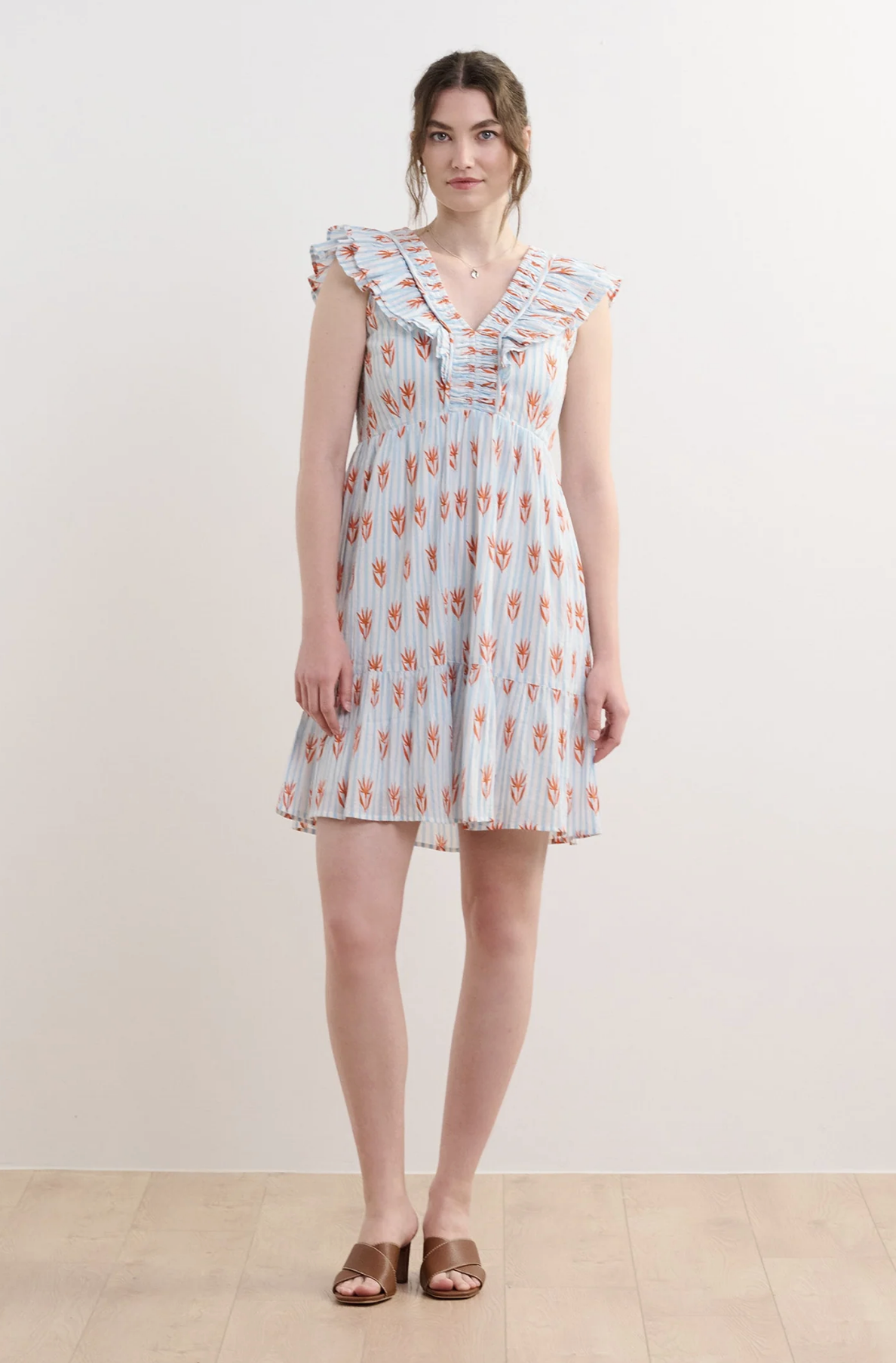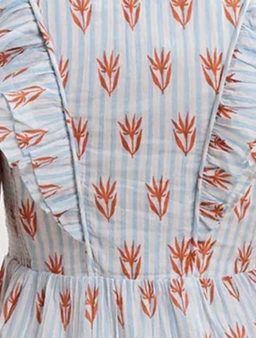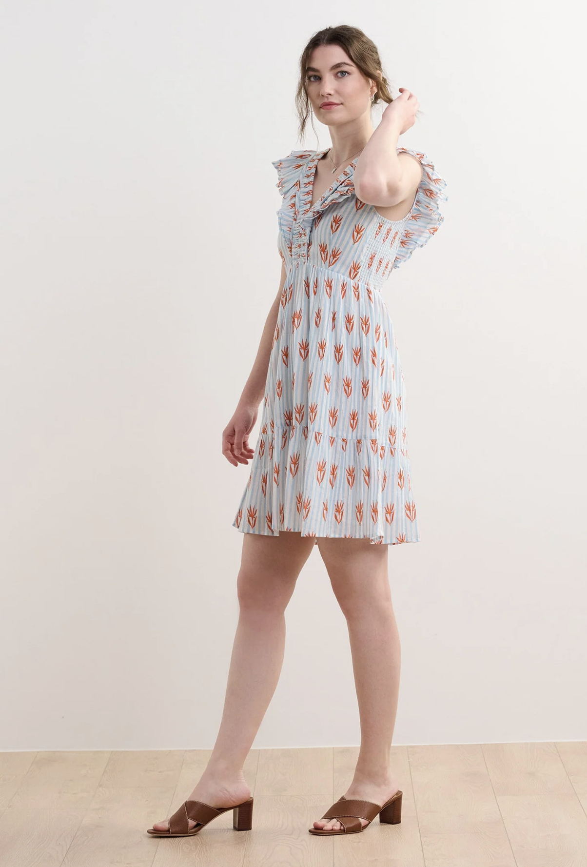 The Zoe Dress brings playful elegance with its floral-striped design. Made from lightweight cotton, this fully-lined flirty sundress features a tiered skirt, smocking at the ribs, an empire waist, and ruffled sleeves that extend down the front and back bodice for a touch of feminine charm. The breezy silhouette makes it ideal for both casual outings and evening events. Add simple accessories to complete this eye-catching look.
